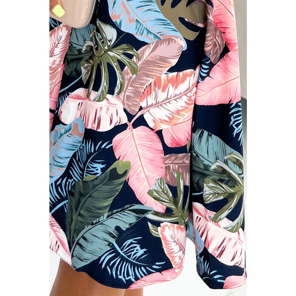 114-17 Šaty - srdiečkový výstrih - tmavomodrá s ružovými listami