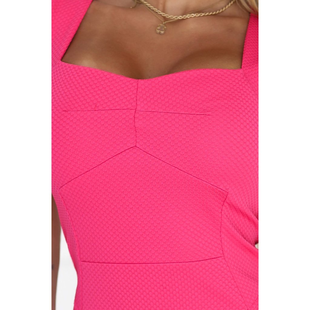 Priliehavé minišaty v sýto ružovej farbe s krátkymi rukávmi a geometrickým prešívaním. Lichotia postave a priťahujú pozornosť. Od Numoco – ideálne na večierok alebo rande.