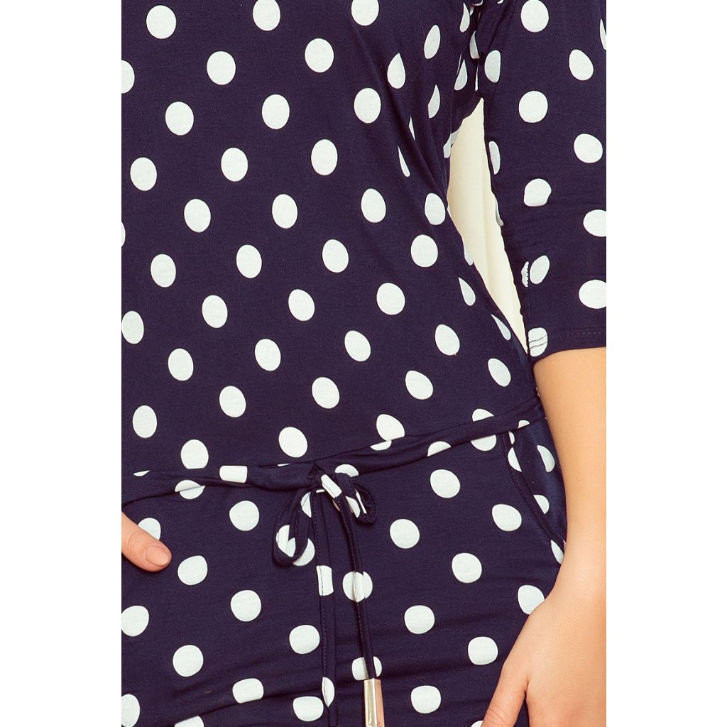 Športové šaty s viazaním vpredu, vrecká, lodný výstrih a 3/4 rukávy - tmavomodrá s bielymi bodkami. Poľská produkcia. Vyrobené z príjemného elastického materiálu. Značka numoco.