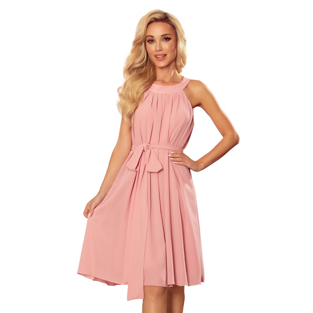 Alizee - šifónové šaty s opaskom a kravatou na chrbte. Farba: púdrová ružová. Značka Numoco. Poľská produkcia.