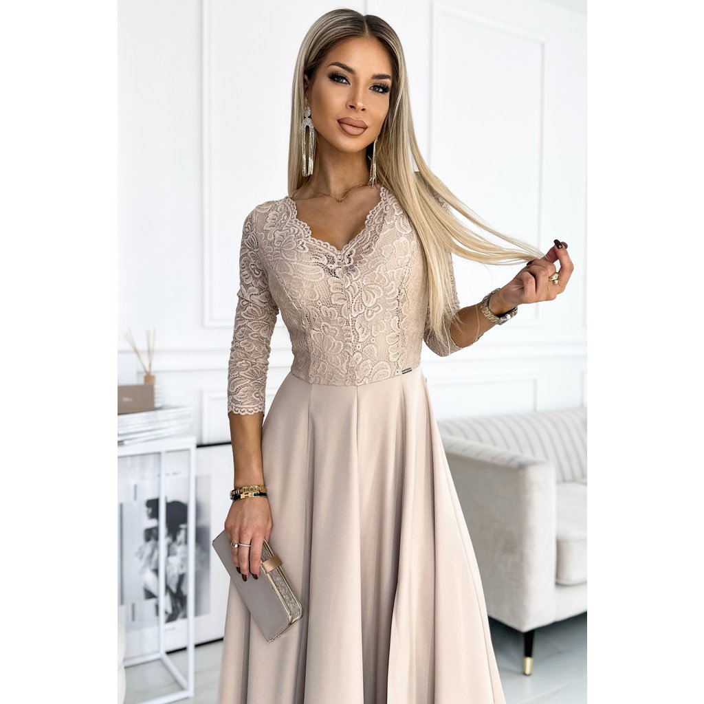 AMBER čipkované, elegantné dlhé šaty s výstrihom a rozparkom pri nohavici - béžové 309-10