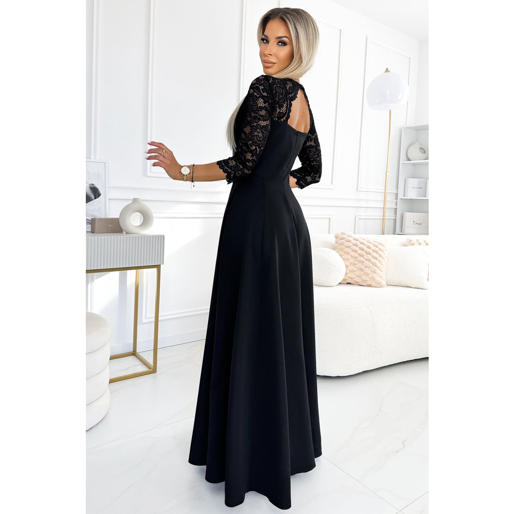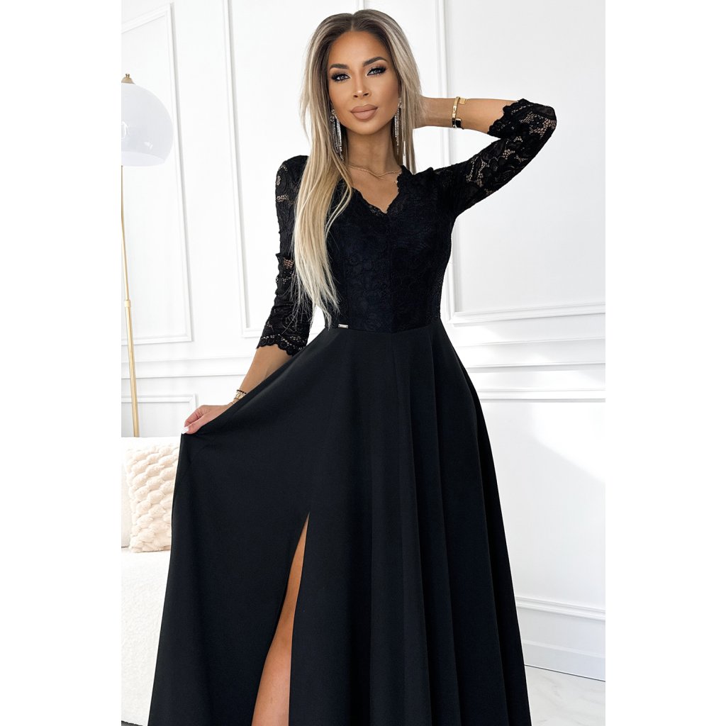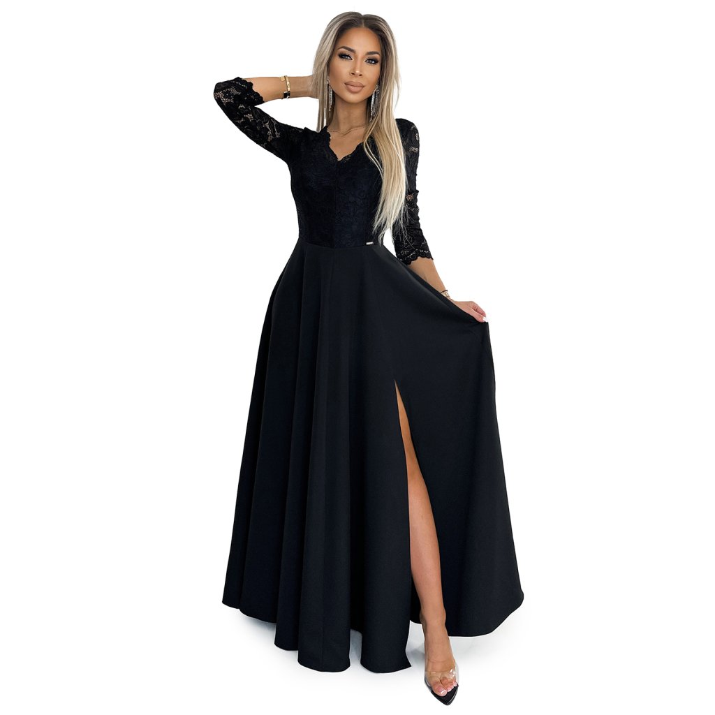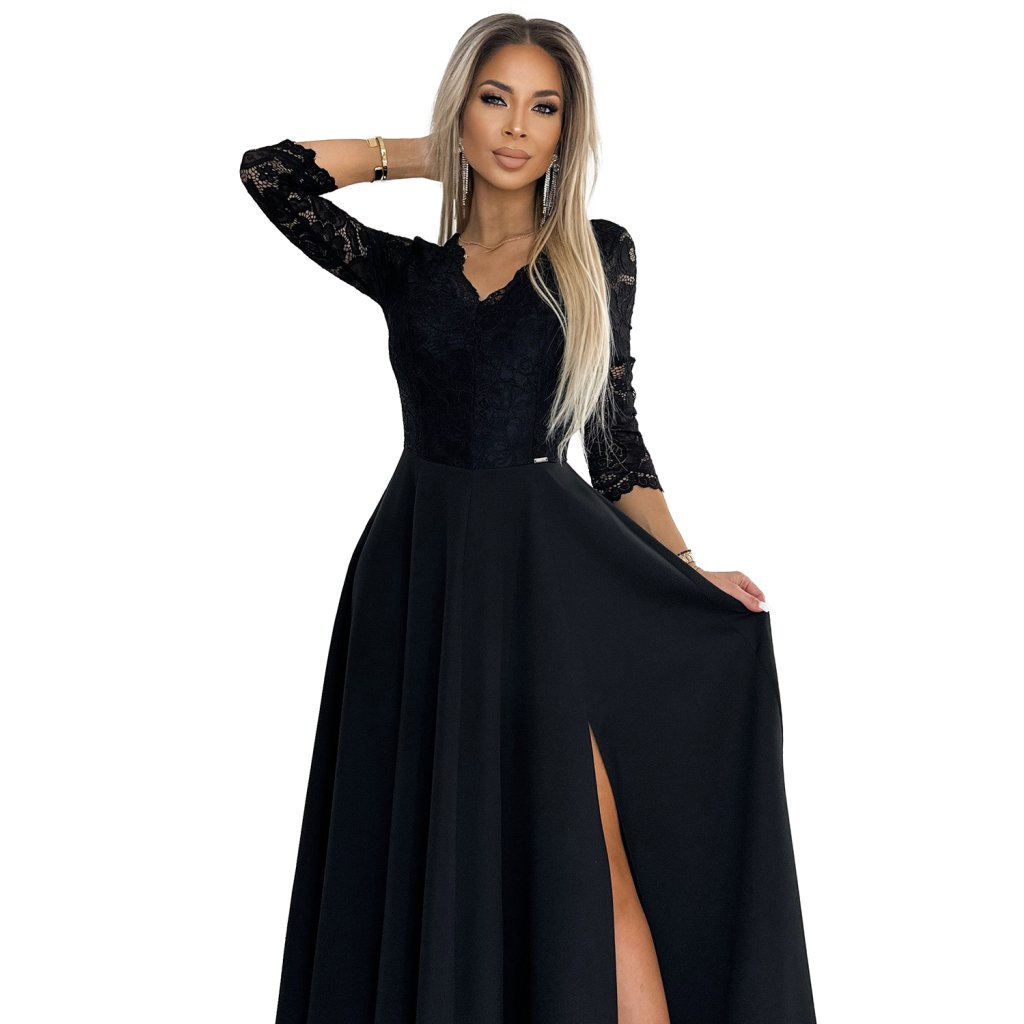 AMBER čipkované, elegantné dlhé šaty s výstrihom a rozparkom pri nohaviciach - čierne 309-11