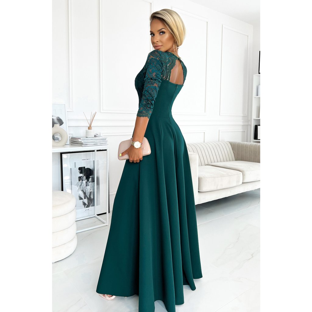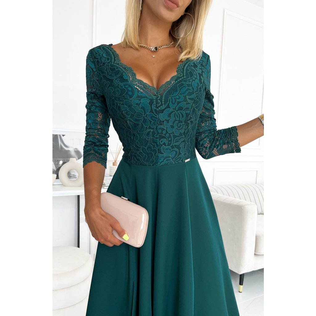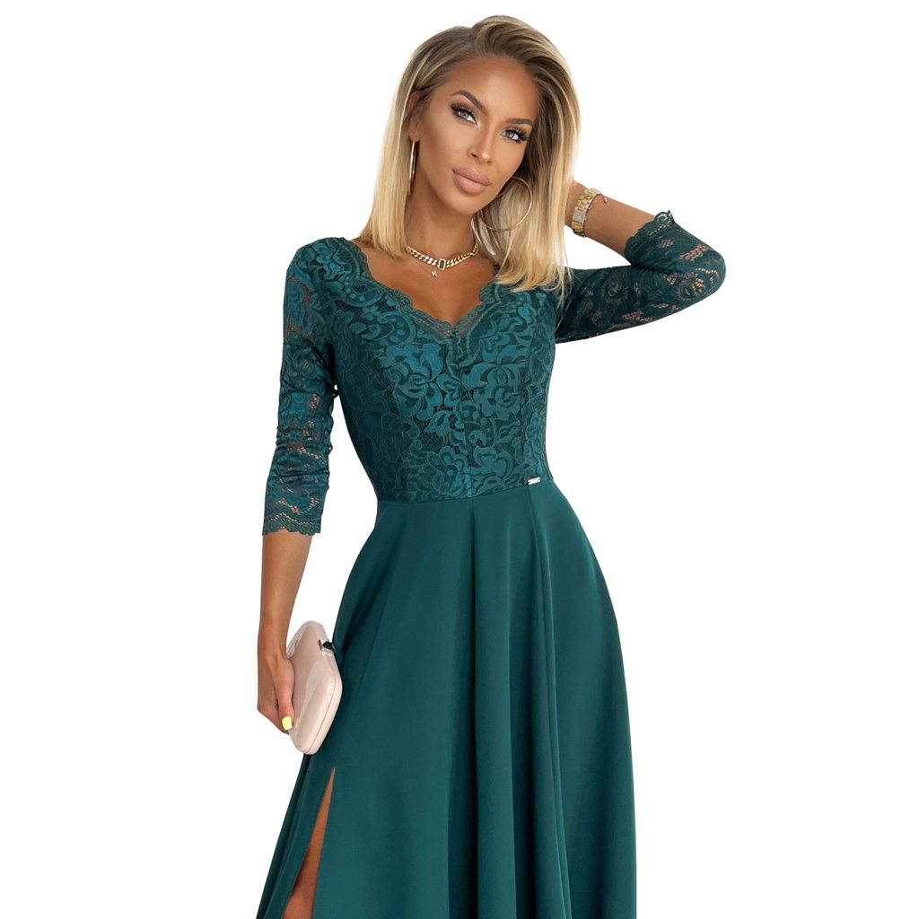 Numoco AMBER elegantné čipkované dlhé šaty s výstrihom - zelené 309-5
