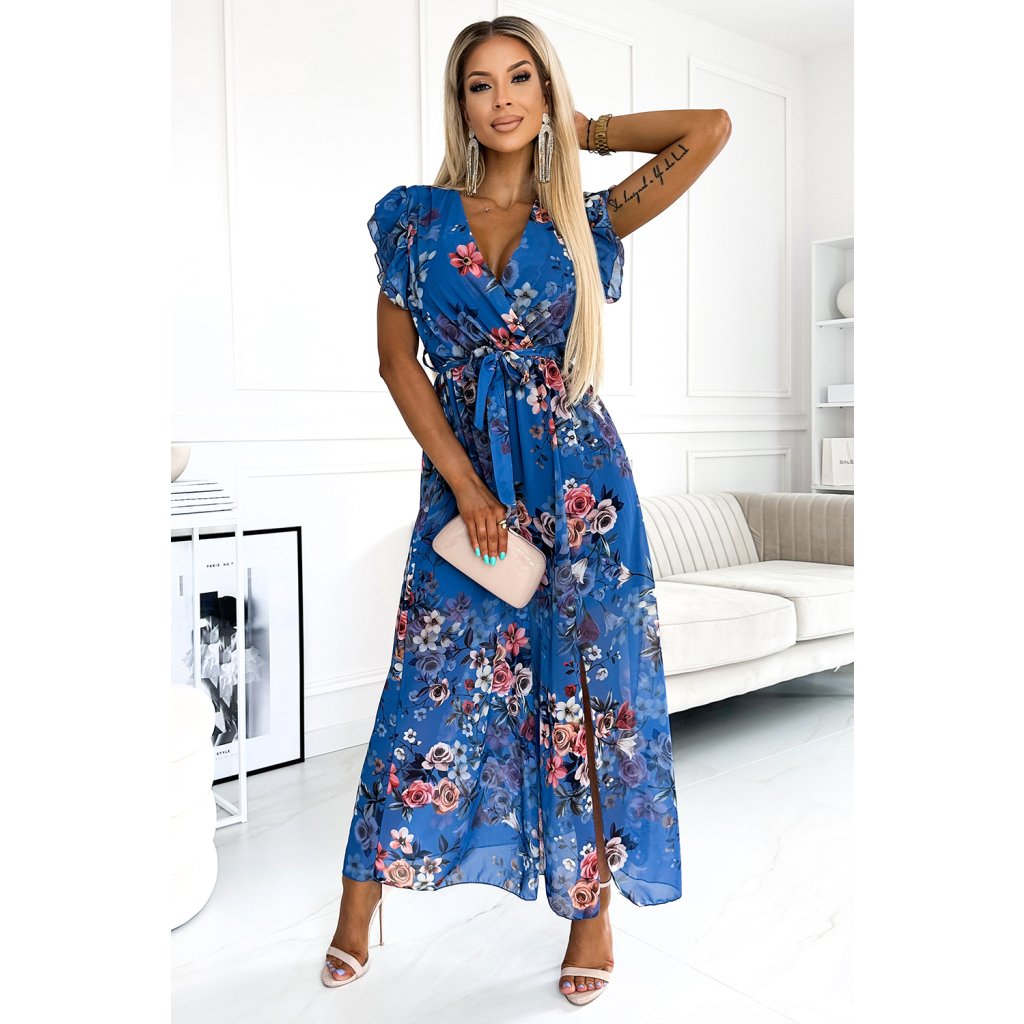 ARIA - Dlhé šifónové šaty s listovým výstrihom, opaskom a krátkymi rukávmi. Vzor: kvety na modrom pozadí. Značka Numoco. európska produkcia.