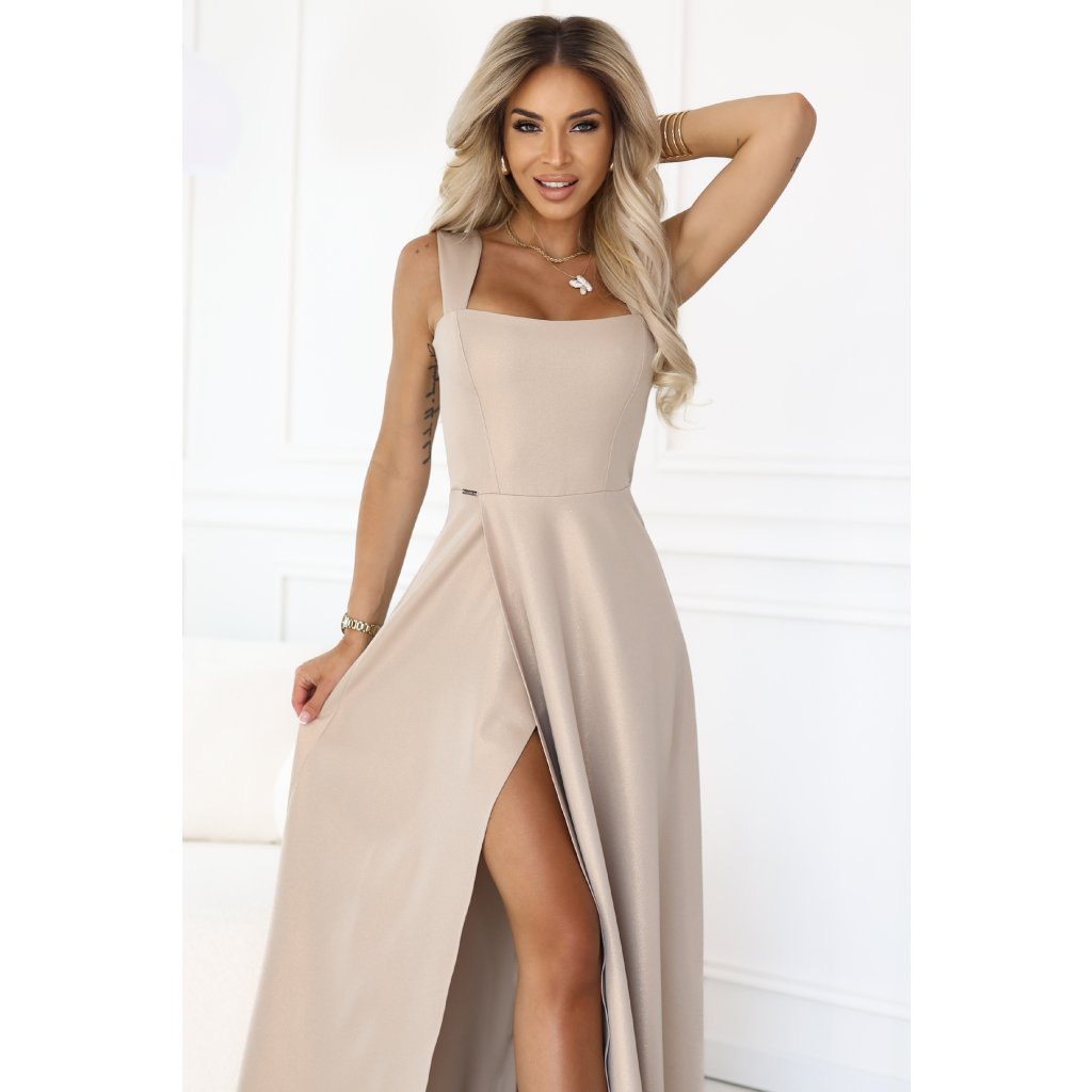 Aurelia – dlhé šaty s rozparkom a štvorcovým výstrihom – béžové s brokátom