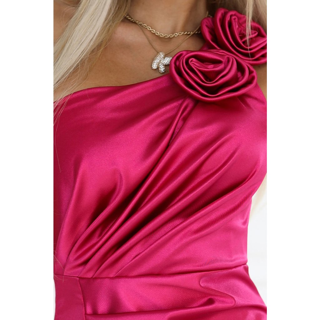 AURORA – saténové šaty na jedno rameno s ružou – ružové
