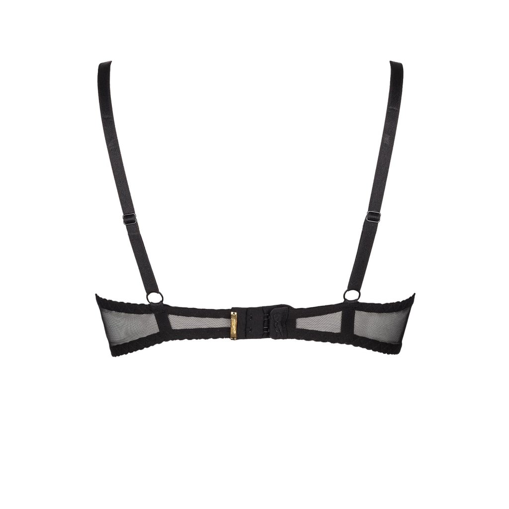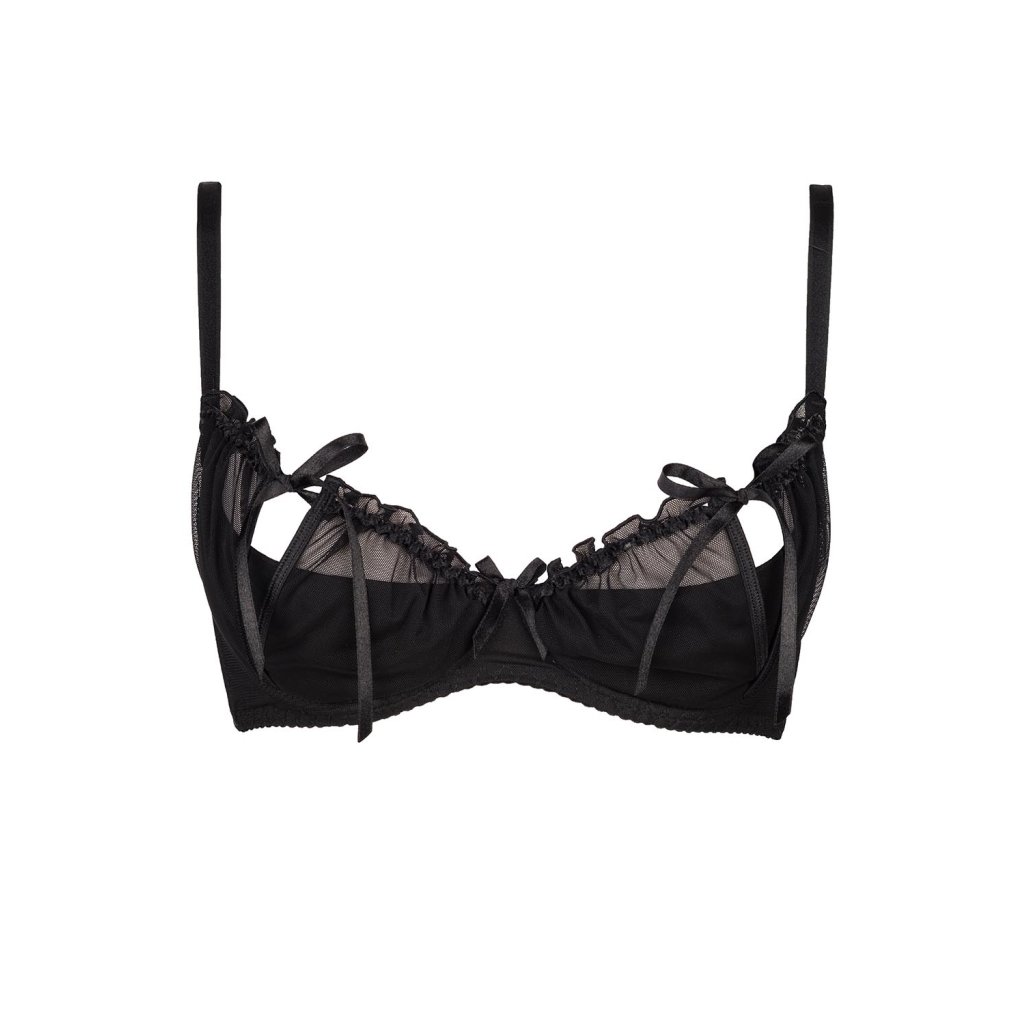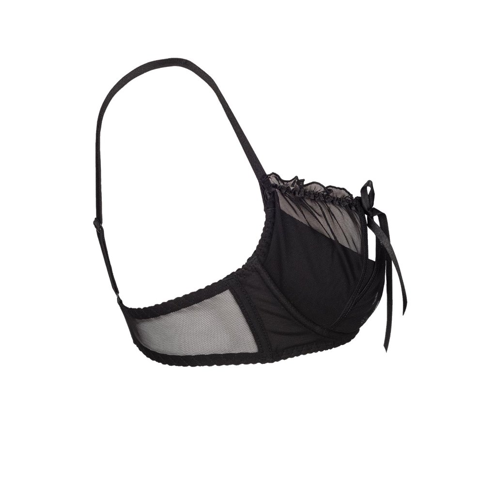 Sexi čierna polovičná podprsenka Charbon zvádza vzrušujúcimi rozparkami na košíčkoch. Podprsenka z jemnej tylovej sieťoviny, ktorá vám umožní ešte viac zvýrazniť vašu ženskosť. Koketné mašle a volániky dodávajú celému kúsku šarm. Model má zvislé kostice, nastaviteľné, neodnímateľné ramienka a trojstupňové zapínanie na dva háčiky. Na doplnenie súpravy odporúčame tangá a opasok Charbon.Zloženie: 63% polyamid, 16% bavlna, 10% polyuretán, 7% polyester, 4% elastan.