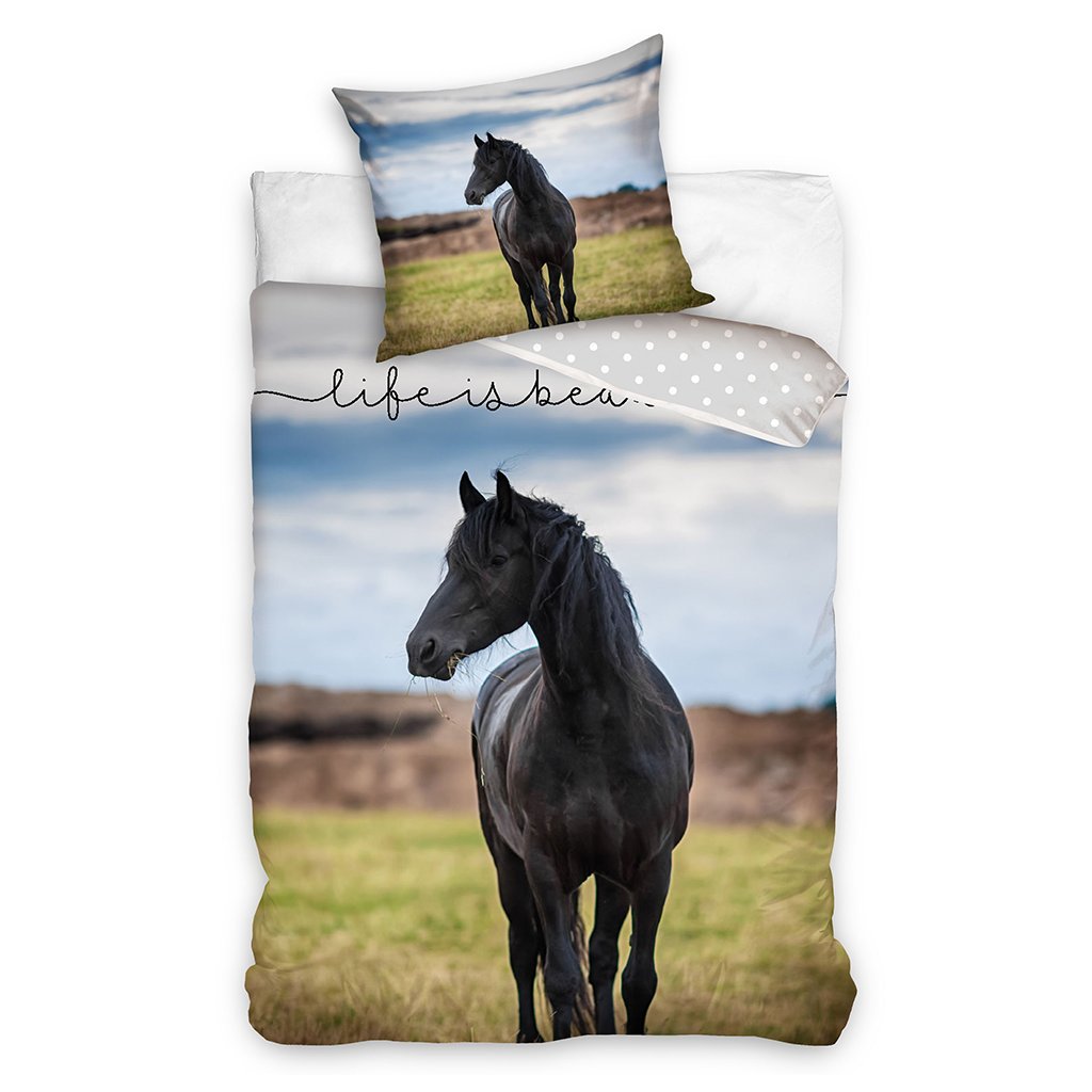 Na prednej strane obliečky je krásny čierny mustang pasúci sa na lúke