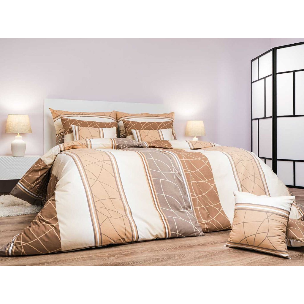Moderná posteľná bielizeň s geometrickým vzorom Bruno opál v odtieňoch béžovej a bielej prináša do spálne decentnú eleganciu a pokoj. Vzor tvoria jemné línie a pruhy, ktoré pôsobia harmonicky a nadčasovo. Posteľnú bielizeň odporúčame kombinovať s plachtami vo farbe opálová, medová, banánová alebo biela. Vyrobené v Českej republike firmou DADKA VRACOV.