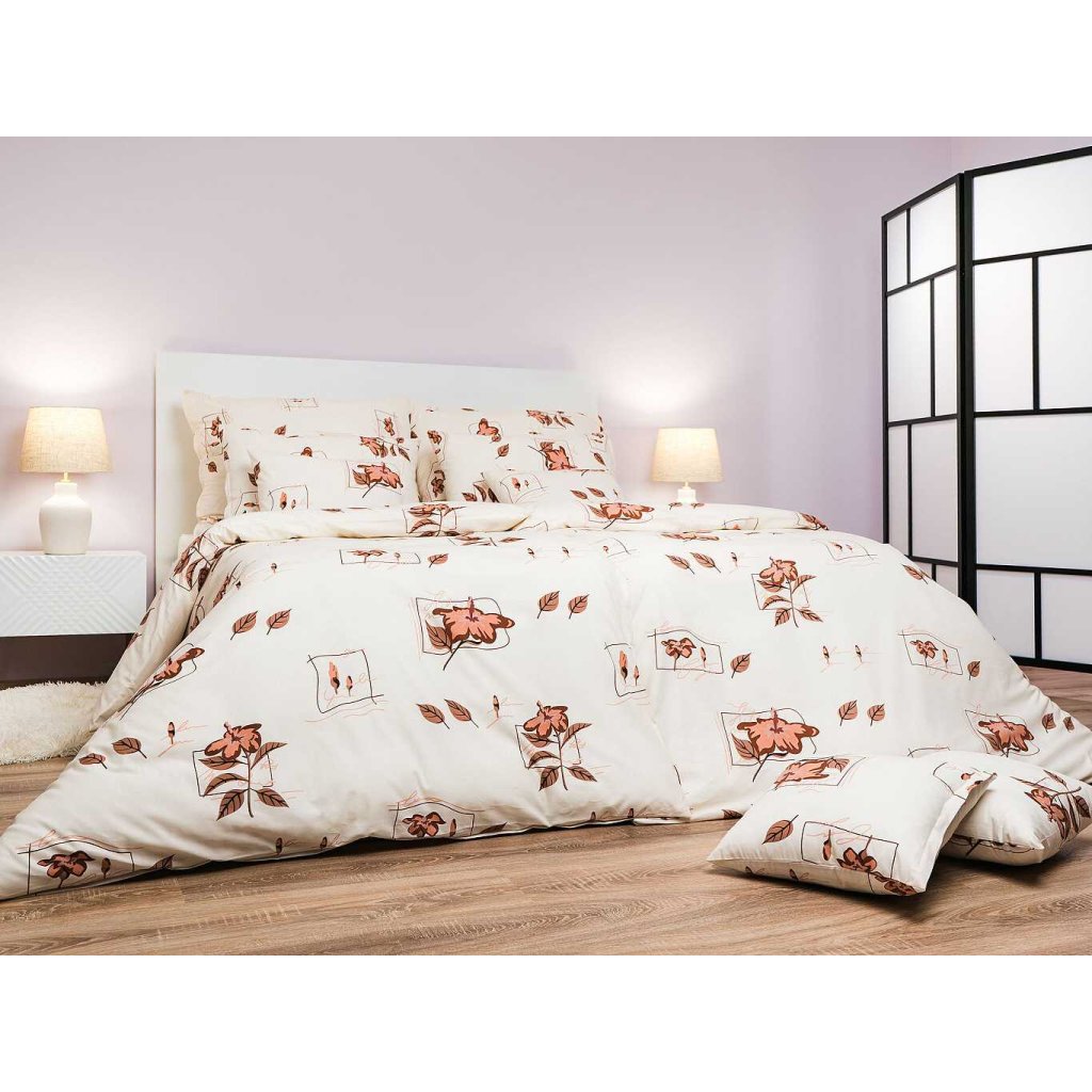 Elegantná posteľná bielizeň s florálnym vzorom Ibištek banánový v odtieňoch hnedej a béžovej prináša do spálne prírodný pokoj a teplú atmosféru. Motív ibišteka na svetlom podklade pôsobí jemne a harmonicky. Obliečky odporúčame kombinovať s plachtami vo farbe banánová, nugátová alebo tmavo hnedá. Vyrobené v Českej republike firmou DADKA VRACOV.