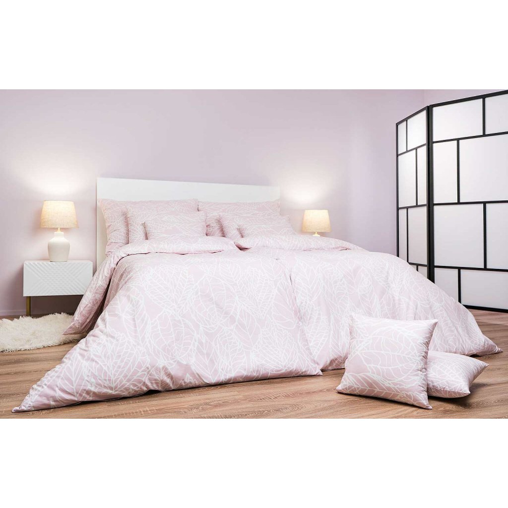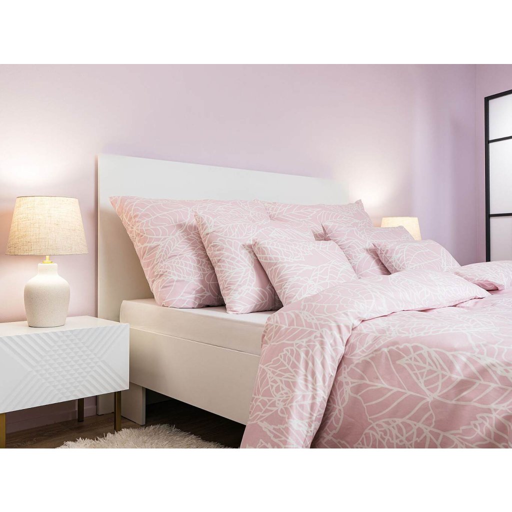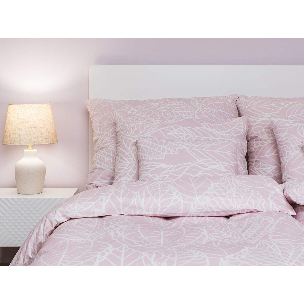 Elegantné bavlnené obliečky Max púdrový s jemným bielym listovým vzorom na púdrovom ružovom podklade vnesú do vašej spálne pokoj a jemnosť. Odporúčame kombinovať s plachtami vo farbe biela alebo púdrová pre harmonický vzhľad.