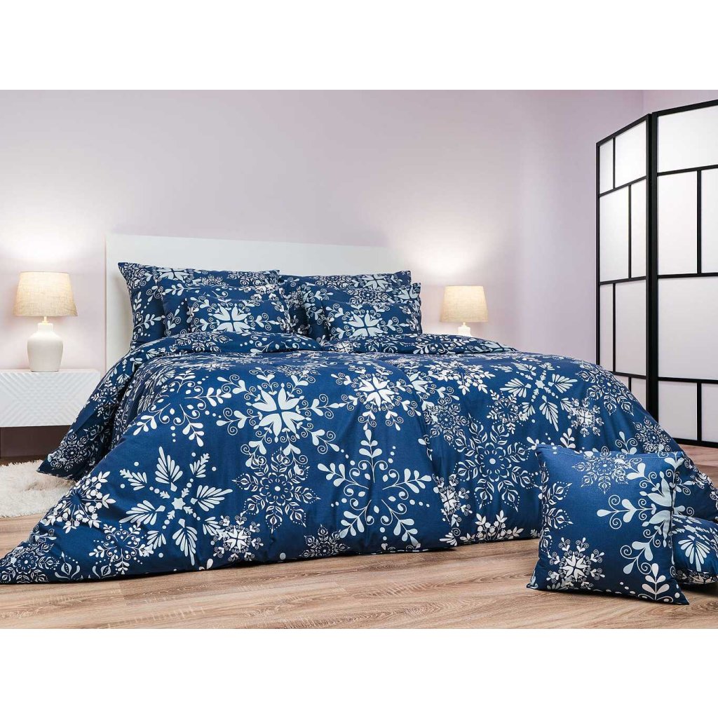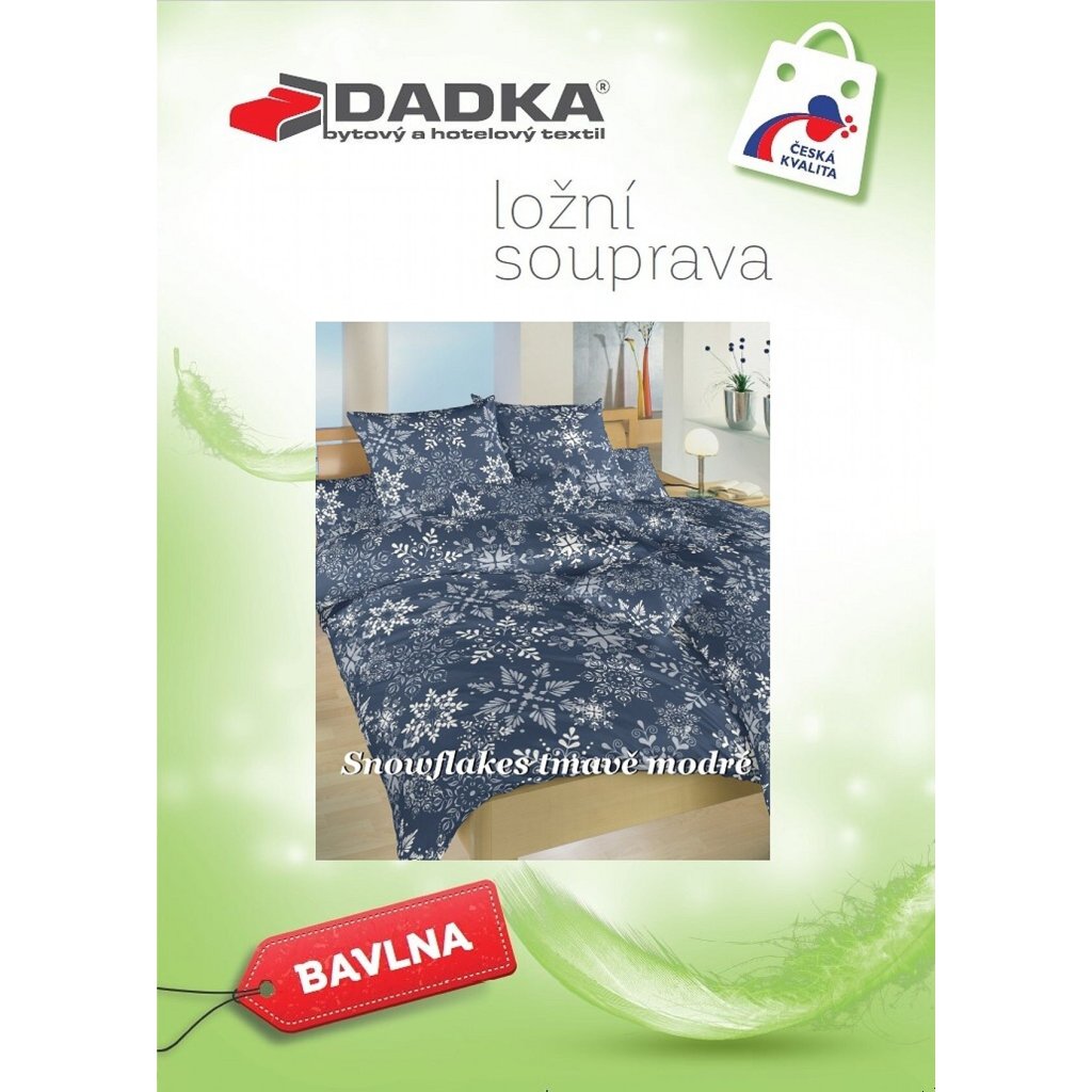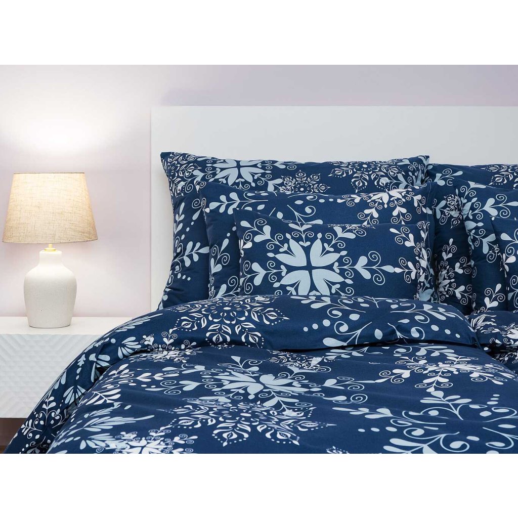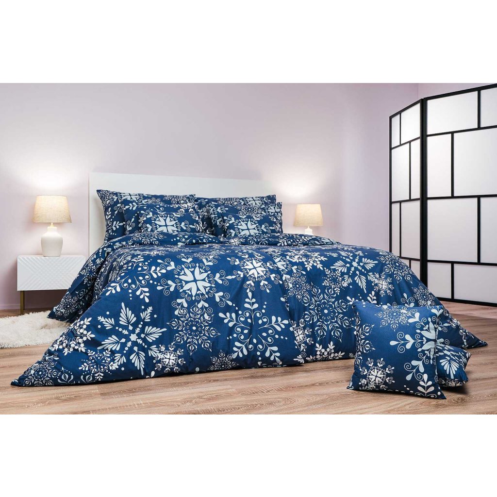 Štýlová posteľná bielizeň Snowflakes tmavo modré s motívom bielych snehových vločiek na tmavo modrom podklade prináša do spálne zimnú atmosféru a elegantný kontrast. Najlepšie vynikne v kombinácii s plachtou vo farbe biela. Vyrobené v Českej republike firmou DADKA VRACOV.