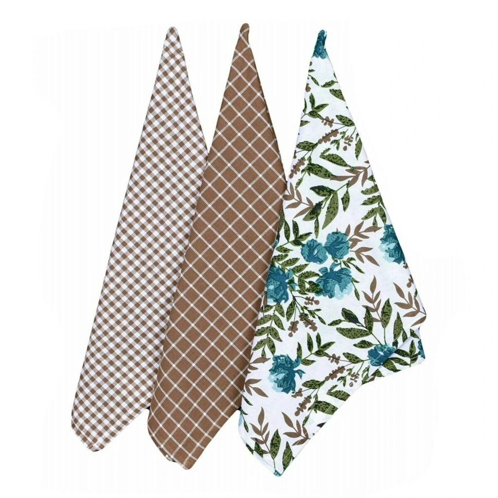 Súprava troch kuchynských utierok Gardena blue dodá každej kuchyni vkusný a harmonický štýl. Súprava obsahuje dve utierky so šachovnicovým vzorom v hnedo-bielej farbe (malá šachovnica a diagonálna šachovnica s krížovým šrafovaním) a jednu utierku s kvetinovým motívom - modré kvety na bielom pozadí so zelenými listami. Kombinácia žakárového tkania a hladkej potlačenej bavlny je dekoratívna a nadčasová.