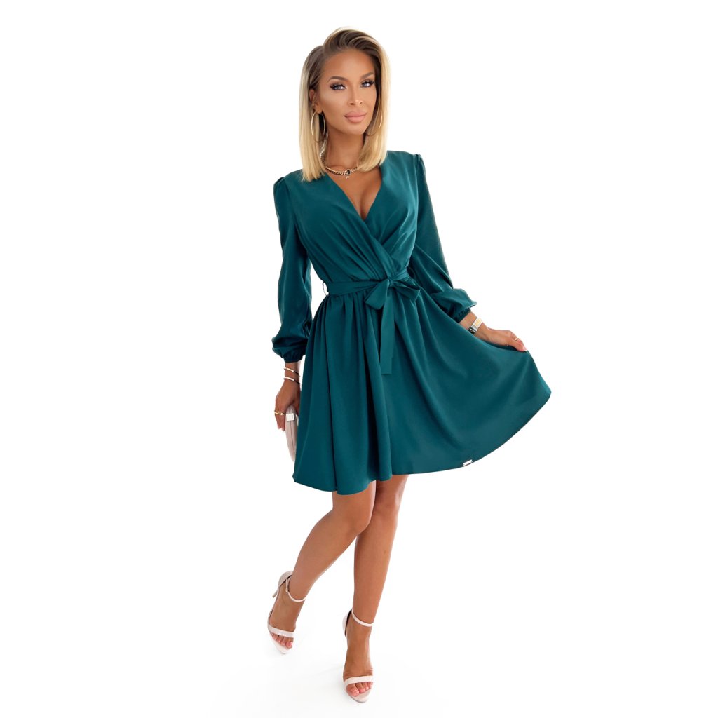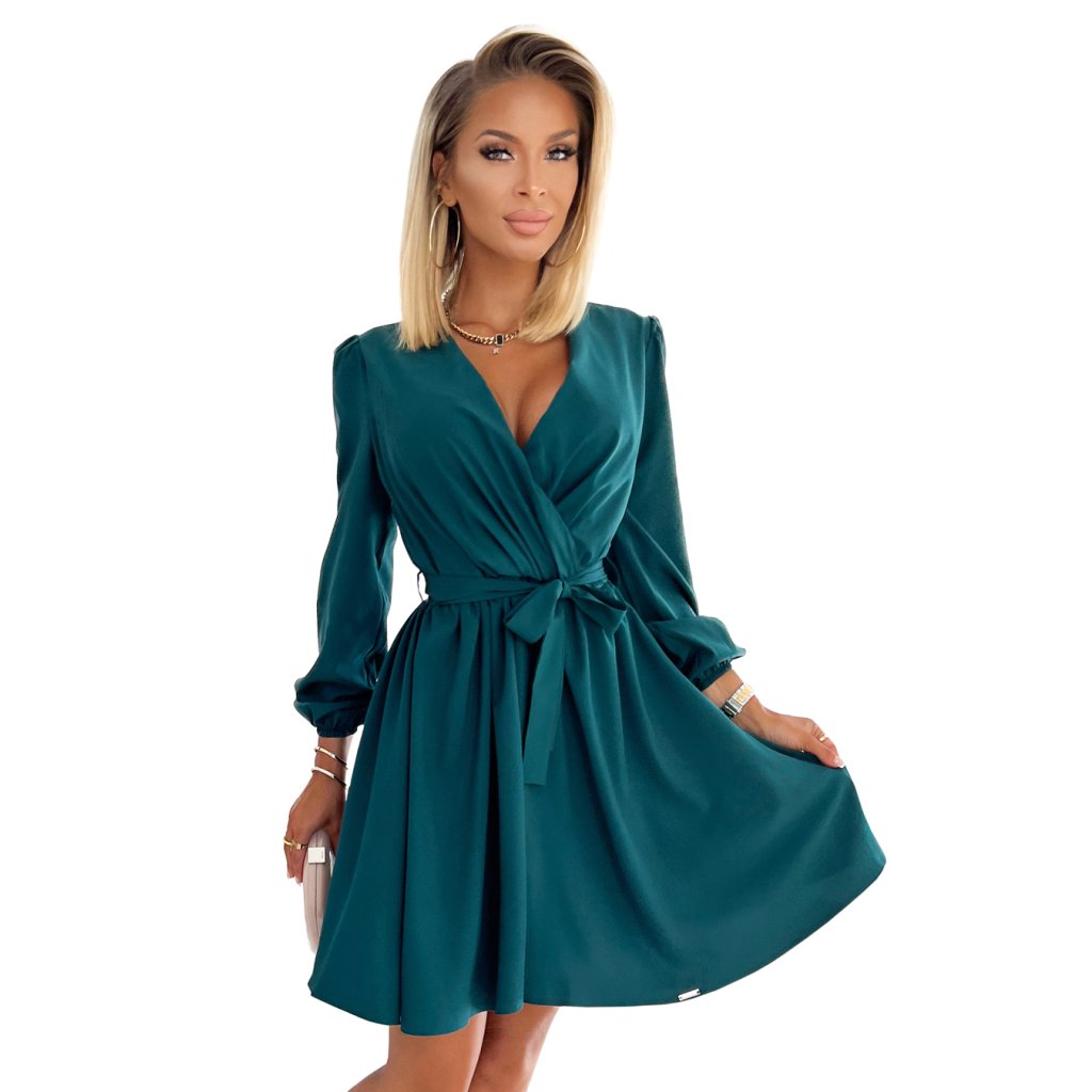 Bindy - dámske šaty s výstrihom do obálky, viazaním v páse a elastickými pásikmi na rukávoch. Zelená farba. Poľská produkcia. Značka Numoco.