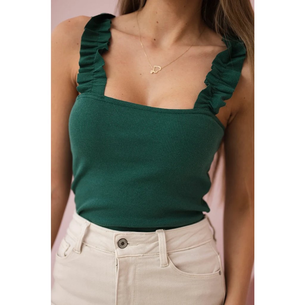 Predstavujeme vám módnu blúzku. Blúzka bez ramienok s volánmi. Priliehavá blúzka z rebrovanej tkaniny. Blúzka je vyrobená z kvalitného materiálu. Veľkosť je univerzálna a vyhovuje dámam, ktoré nosia veľkosť S, M alebo L.