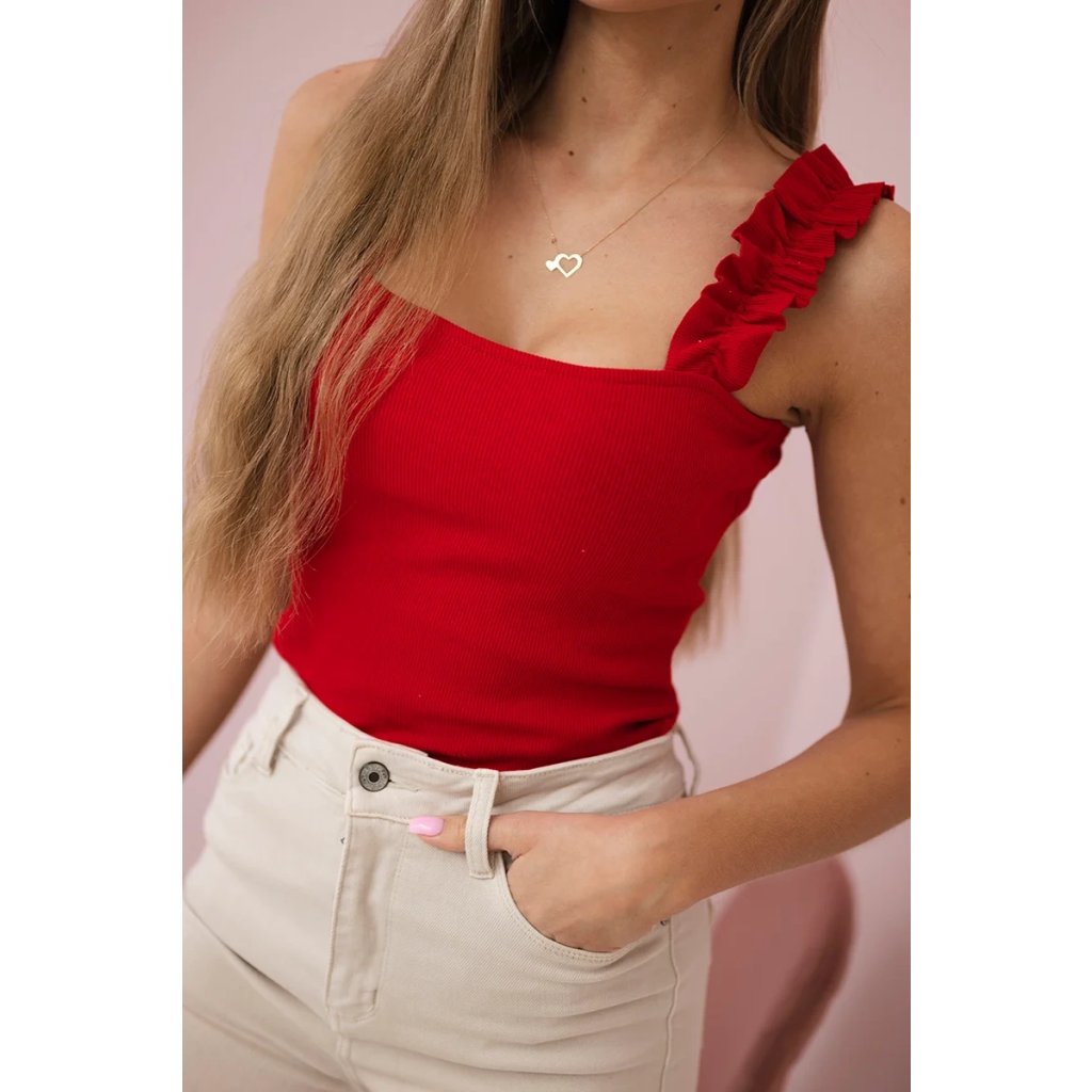 Predstavujeme vám módnu blúzku. Blúzka bez ramienok s volánmi. Priliehavá blúzka z rebrovanej tkaniny. Blúzka je vyrobená z kvalitného materiálu. Veľkosť je univerzálna a vyhovuje dámam, ktoré nosia veľkosť S, M alebo L.
