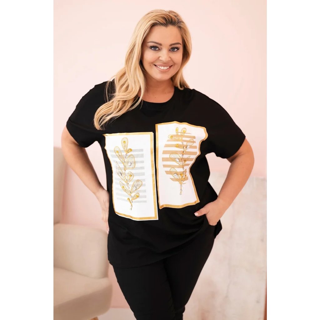 Táto dámska blúzka s krátkym rukávom je ideálnou voľbou pre ženy, ktoré si cenia pohodlie a štýlový vzhľad na každý deň. Jej voľný strih typu oversize skvele padne na postavu a zaisťuje úplnú voľnosť pohybu. Ozdobná potlač s motívom listov v zlatom prevedení, doplnená o jemné kamienky a kontrastné pruhy, dodáva blúzke módny a pútavý charakter. Blúzka je skvelá ako na každodenné nosenie, tak aj na stretnutia s priateľmi alebo víkendové vychádzky. Mäkký materiál s prevahou bavlny je príjemný na dotyk a priedušný, čo zaisťuje vysoký komfort nosenia aj po celý deň. Univerzálny strih sa hodí k legínam, džínsom aj sukniam.