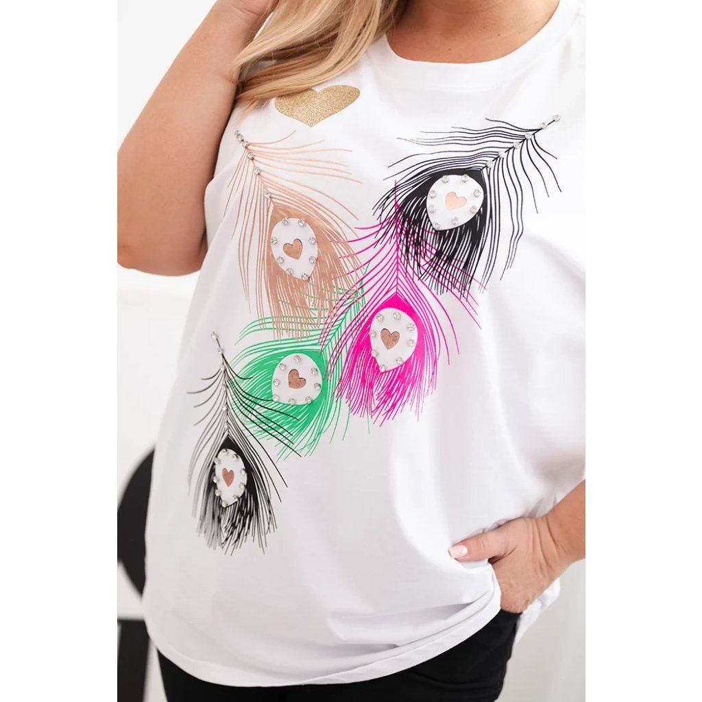 Dámska blúzka s krátkym rukávom a ozdobným motívom peria je ideálnou voľbou pre každé ročné obdobie. Jej voľný strih zaisťuje pohodlné nosenie a pútavá potlač s lesklými prvkami dodáva outfitu jedinečný charakter. Skvelá ako na každodenné nosenie, tak na neformálne príležitosti. Vďaka jemnej bavlne s prímesou elastanu je materiál priedušný a elastický, prispôsobí sa postave bez nepríjemného tlaku. Dekoratívne perie a trblietavé srdiečka jej dodávajú ženský pôvab, ktorý určite upúta pozornosť.