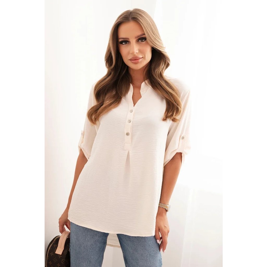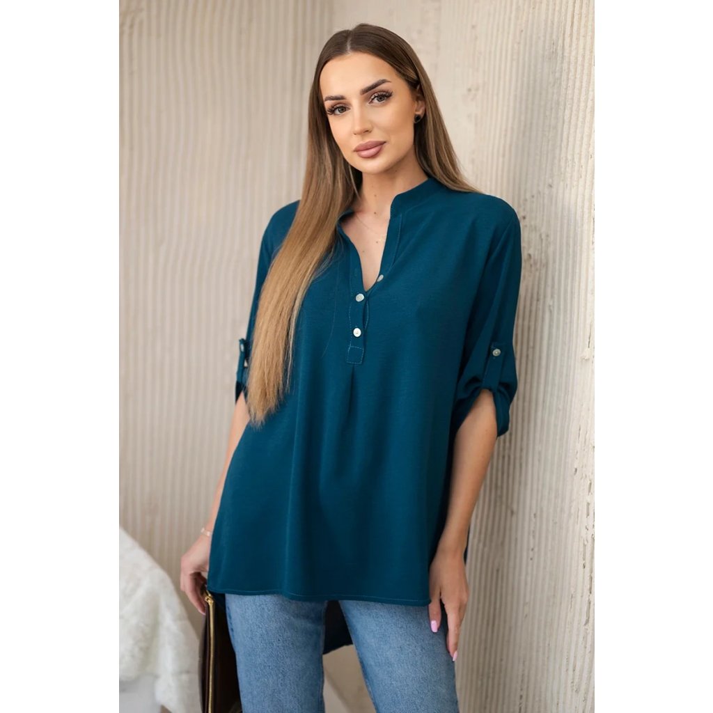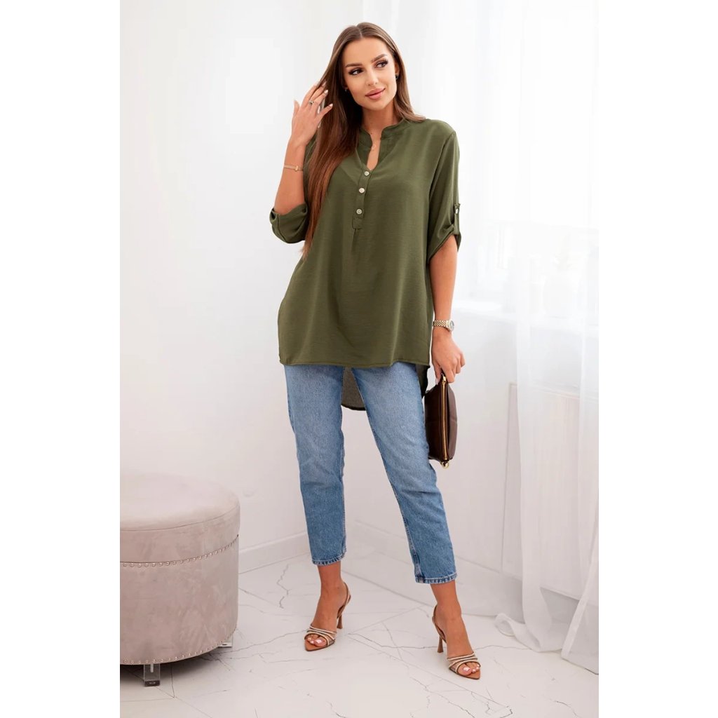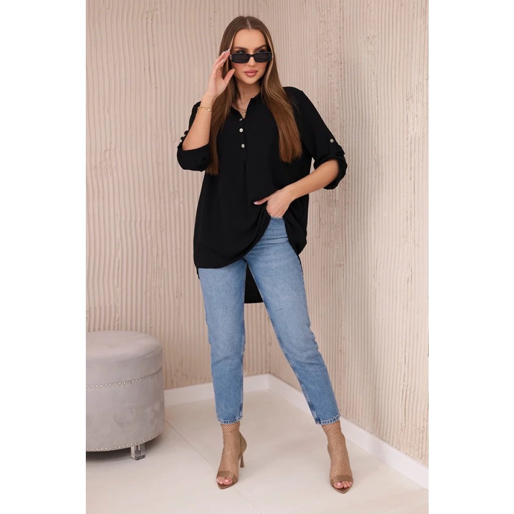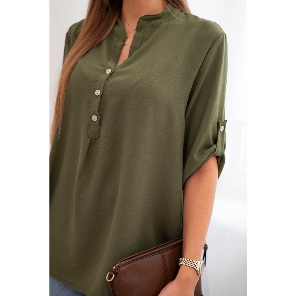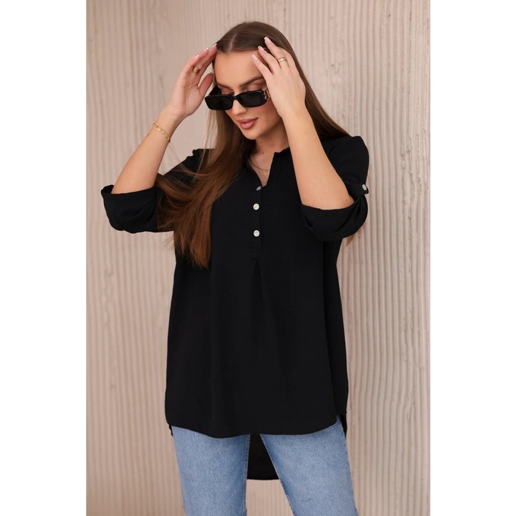 Objavte mimoriadnu eleganciu a pohodlie v prezentovanej blúzke s dlhším zadným dielom, výstrihom na gombíky a ohrnutými rukávmi, ktorá nielenže vyzerá mimoriadne štýlovo, ale poskytuje aj bezkonkurenčnú funkčnosť. Cíťte sa sebavedomo a elegantne v blúzke, ktorá podčiarkne váš jedinečný štýl. Dlhší zadný diel vytvára jemné a módne nepravidelné proporcie a výstrih na gombíky vám umožní prispôsobiť si blúzku podľa vašich predstáv. Vyhrnuté rukávy dodávajú blúzke ľahký a ležérny charakter, ideálny na rôzne príležitosti. Či už ide o obchodné stretnutie alebo pohodovú kávu s priateľmi, naša blúzka vám poskytne pohodlie a štýl v jednom. Nenechajte si ujsť príležitosť pridať túto jedinečnú blúzku do svojho šatníka! Objavte eleganciu, pohodlie a funkčnosť v jednom a podčiarknite svoj jedinečný štýl ešte dnes. Veľkosť je univerzálna a je vhodná pre ženy, ktoré nosia veľkosť S, M alebo L.