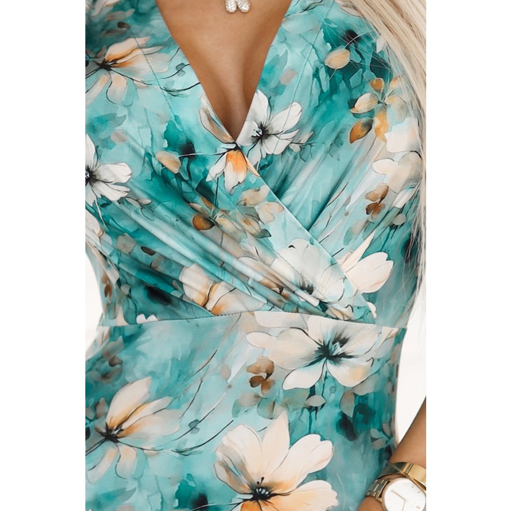 Boyka - vybavené šaty s výstrihom a krátkym rukávom. Štýlový vzor: Béžové kvety na tyrkysovom pozadí. Vyrobené z flexibilného, príjemného na dotyk materiálu. Ideálne na každú príležitosť! Poľská produkcia. Značka Numoco.