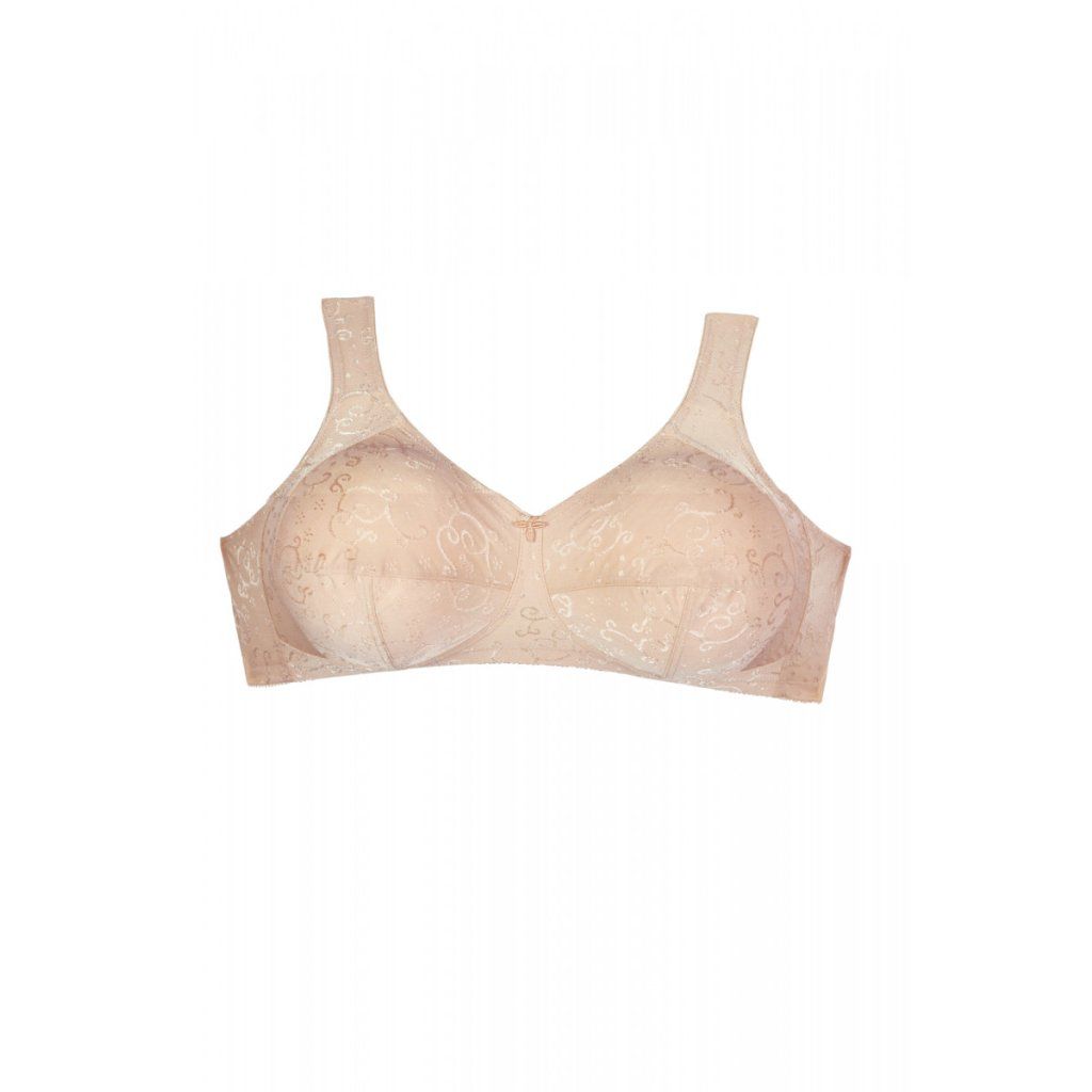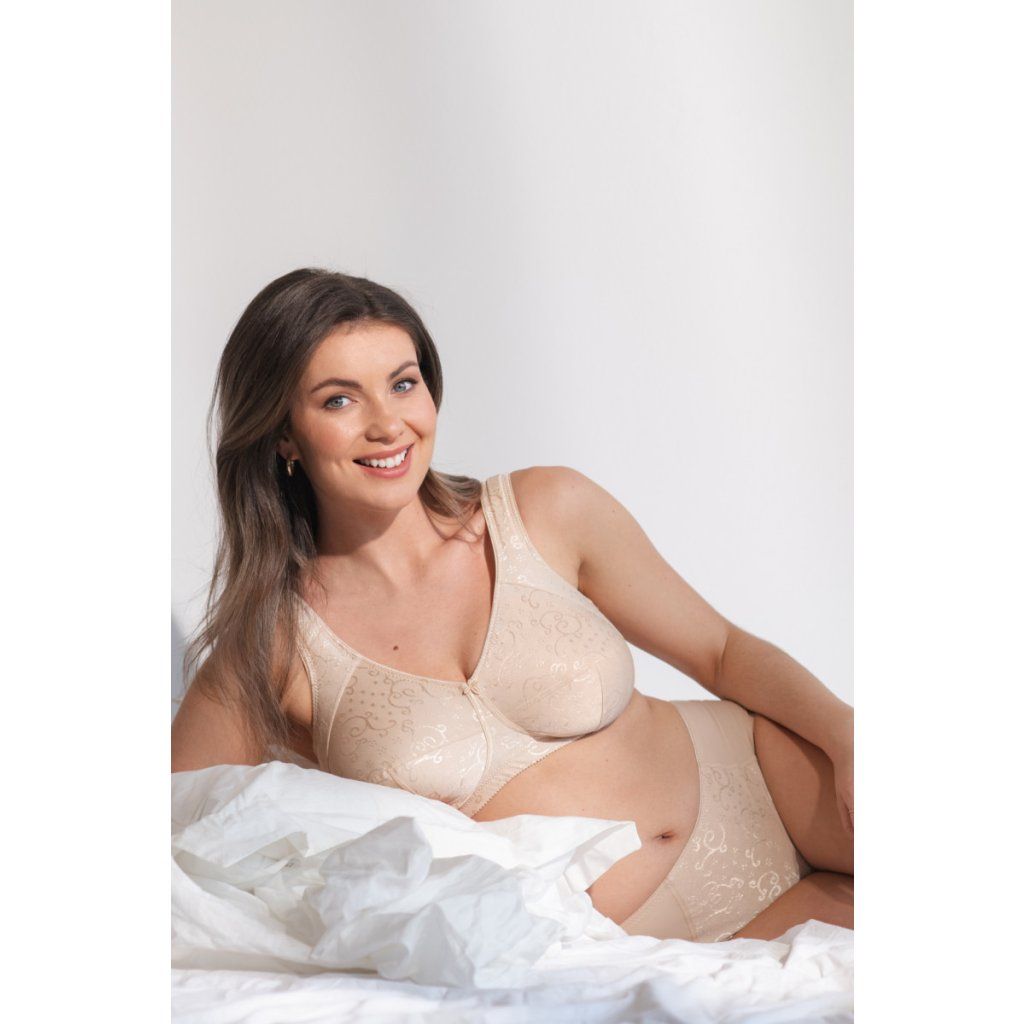 Pohodlná podprsenka s kosticami z jemného úpletu so žakárovým vzorom. Dokonalý tvar je zaručený vďaka perfektne strihaným trojdielnym košíčkom. Bočný panel pomáha zafixovať prsia v strede. Pohodlné predĺžené ramienka zaisťujú maximálne pohodlie pri celodennom nosení.