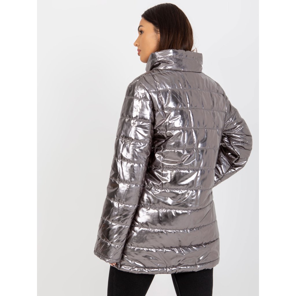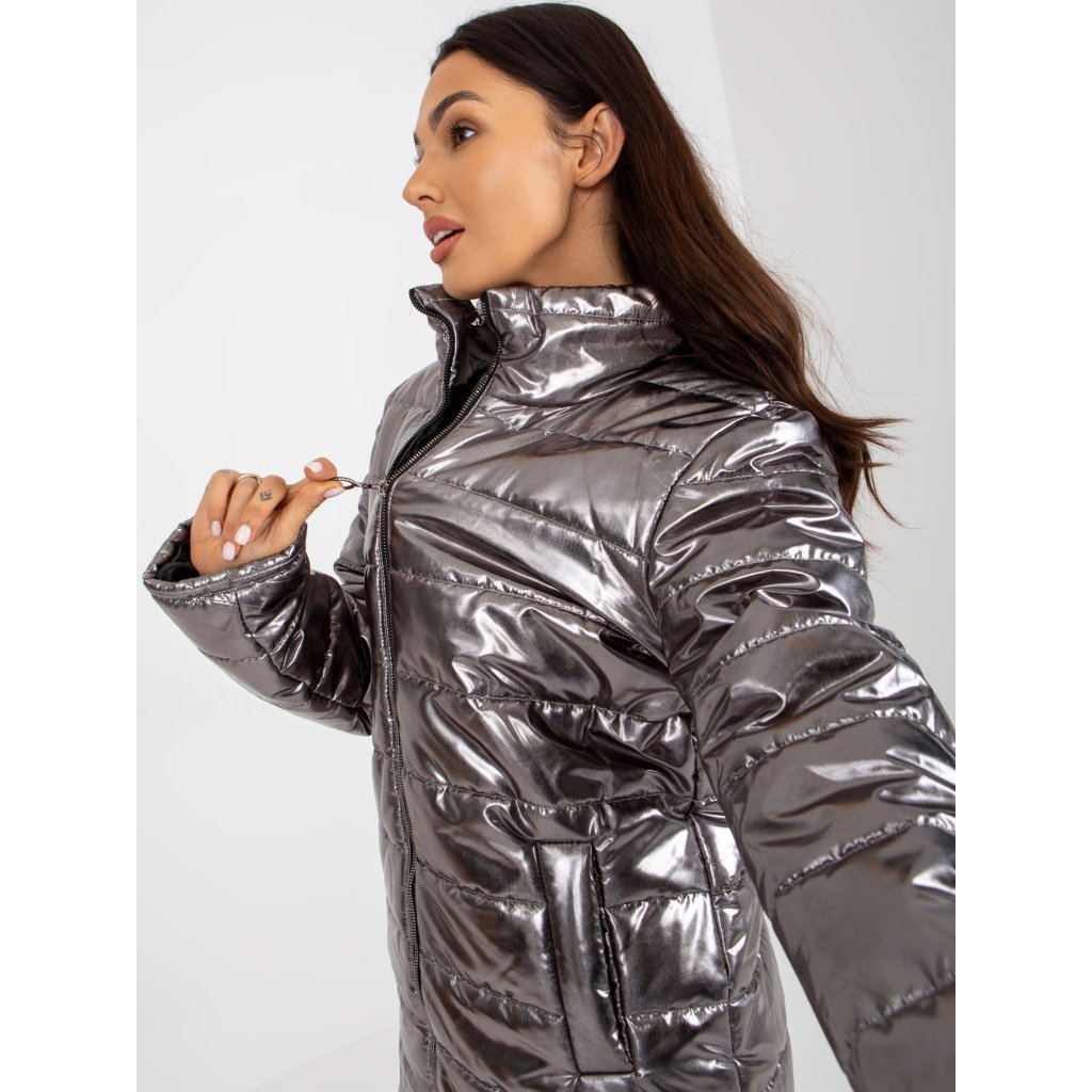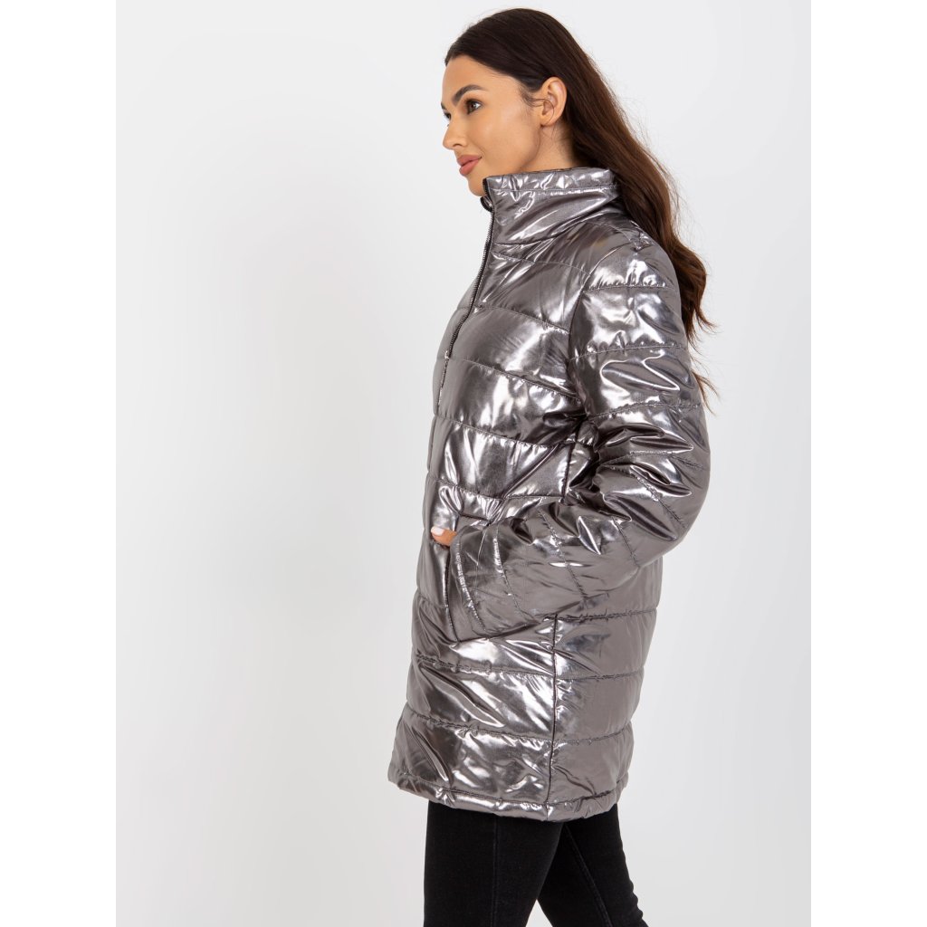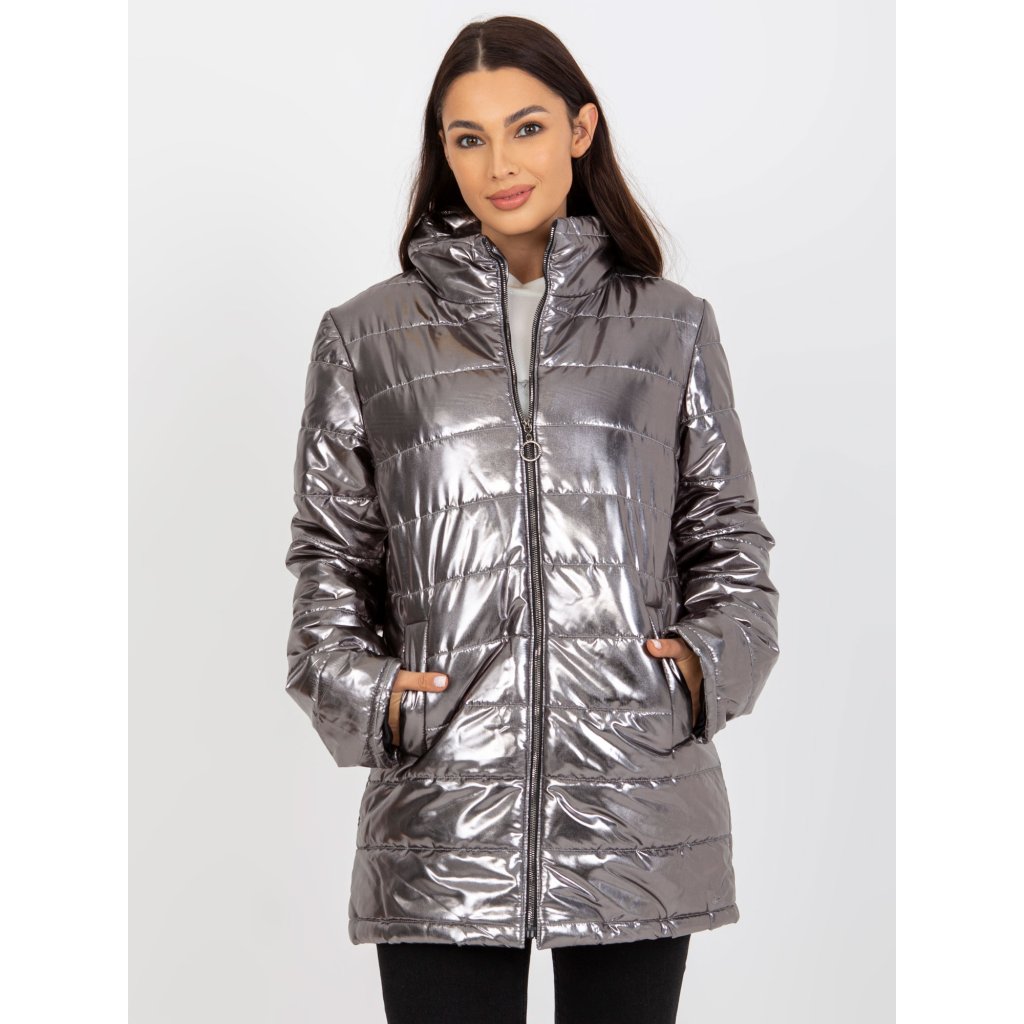 Dámska prešívaná bunda striebornej farby s vreckami.