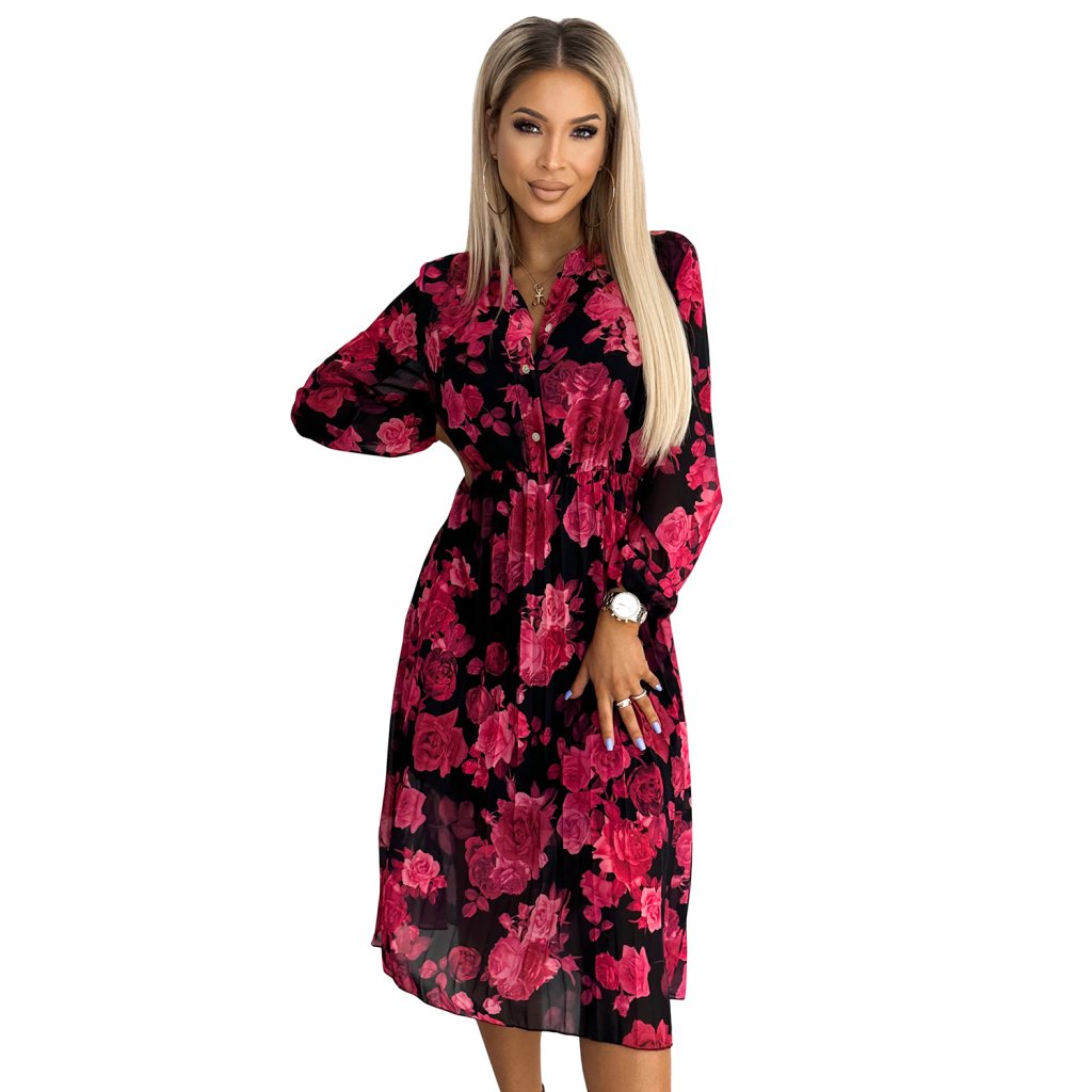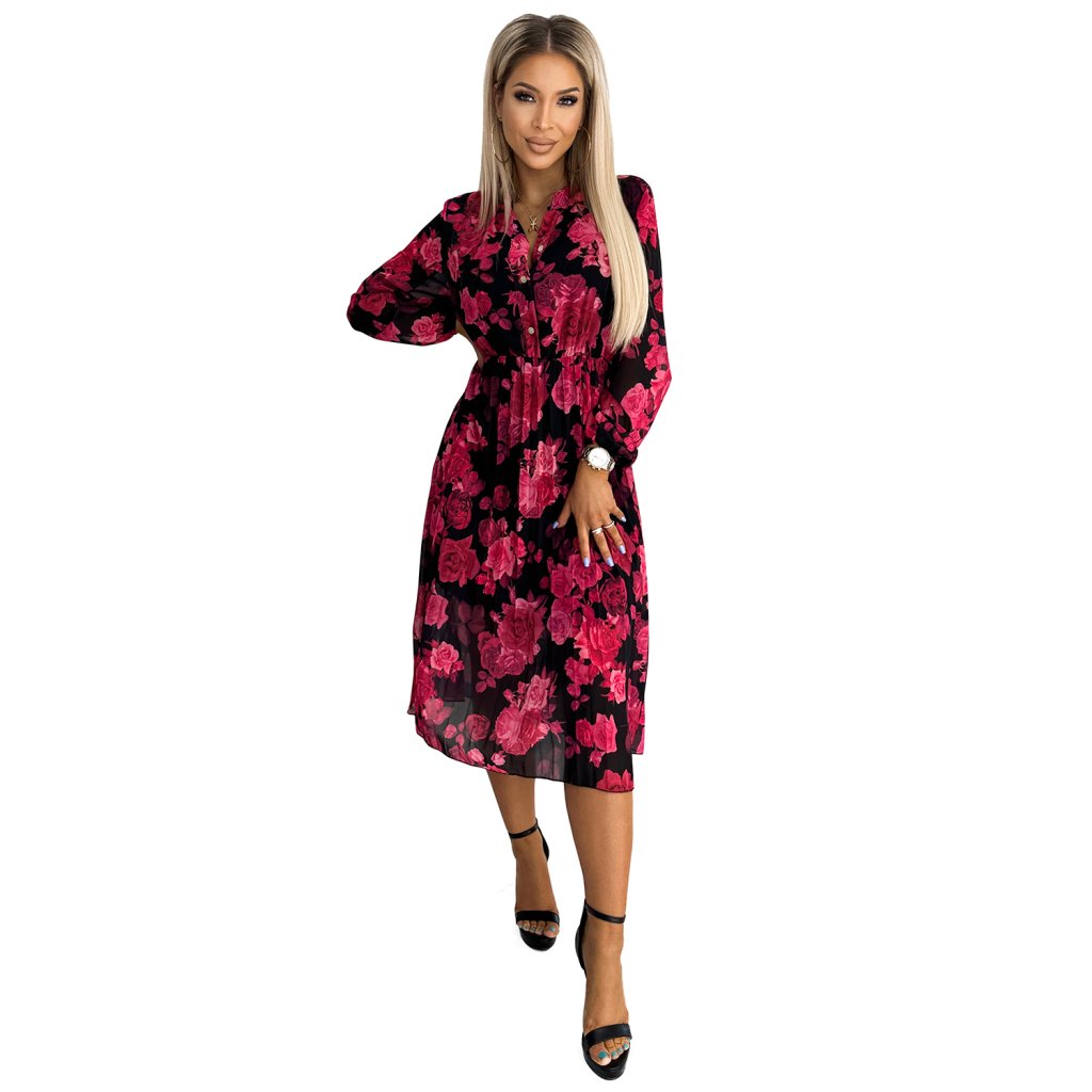 CARLA - šifónové riasené midi šaty na gombíky a dlhý rukáv. Prevedenie: čierna s červenými ružami. Značka Numoco. európska produkcia.