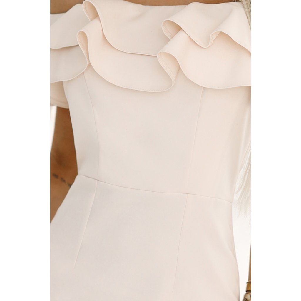 Elegantné španielske šaty s volánmi vo svetlo béžovej farbe. Midi štýl, otvorené ramená, ženský strih. Značka Numoco. Poľský výrobok. Ideálne na svadby, rande a oslavy.