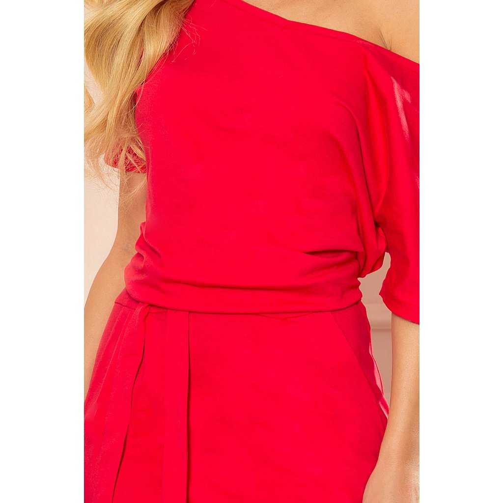 Cassie - Červené šaty s výstrihom, viazaním a vreckami - príjemný na dotyk bavlnený materiál. Poľská výroba. Značka numoco.
