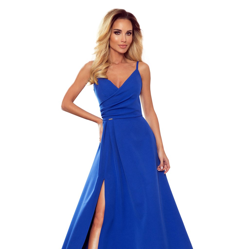 Chiara - elegantné maxi šaty s popruhmi. Krásne tvarovaný výstrih a strih na sukni vytvára neobvyklé zloženie - modrá farba. Poľská produkcia. Značka Numoco.