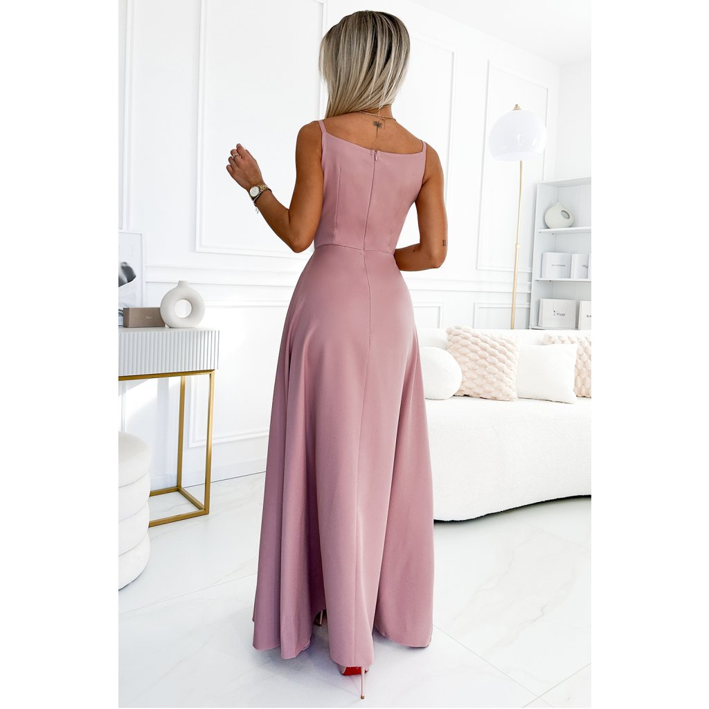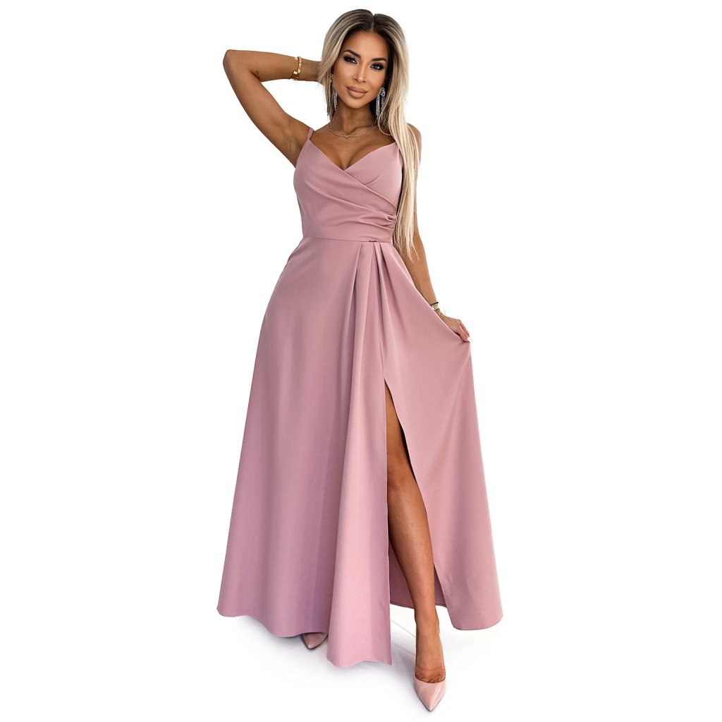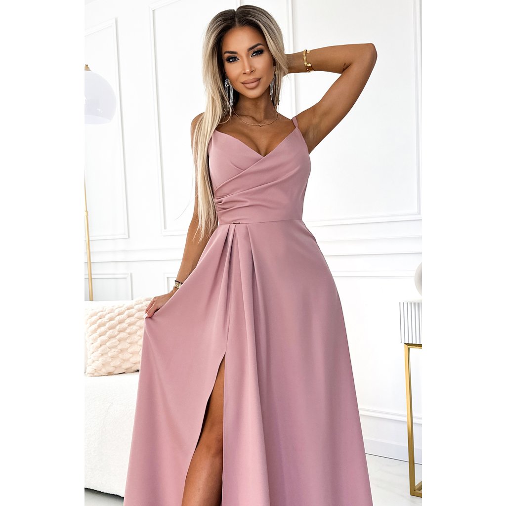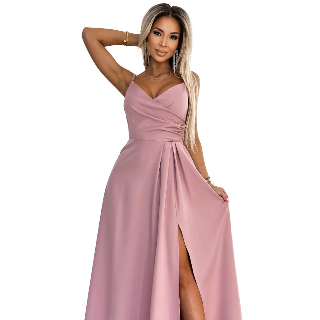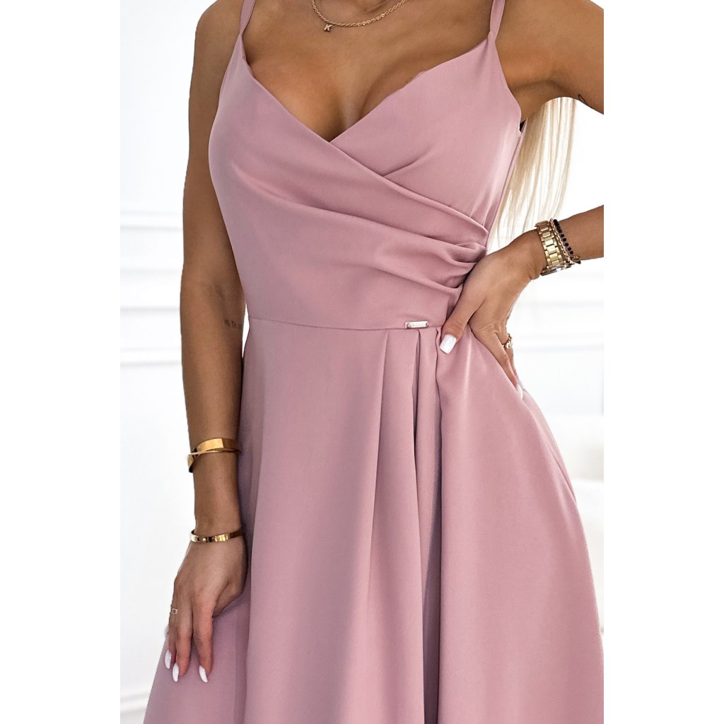 Chiara - elegantné maxi šaty s popruhmi. Krásne tvarovaný výstrih a strih na sukni vytvára neobvyklé zloženie - púdrovú ružovú farbu. Poľská produkcia. Značka Numoco.
