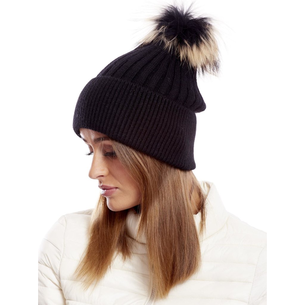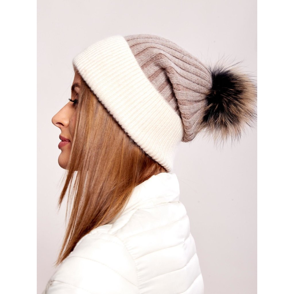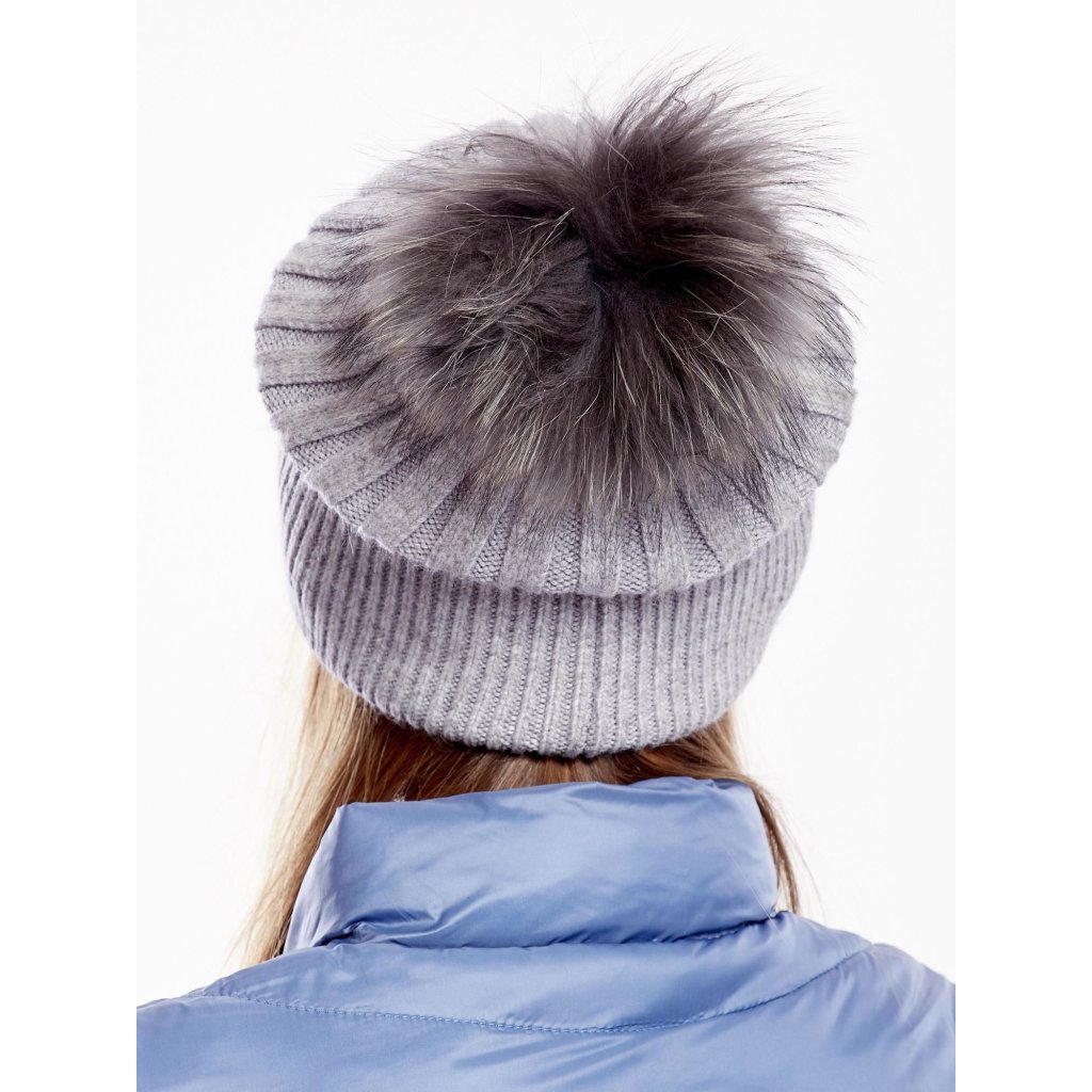Rebrovaná čiapka s kožušinovou brmbolcom, sivá
