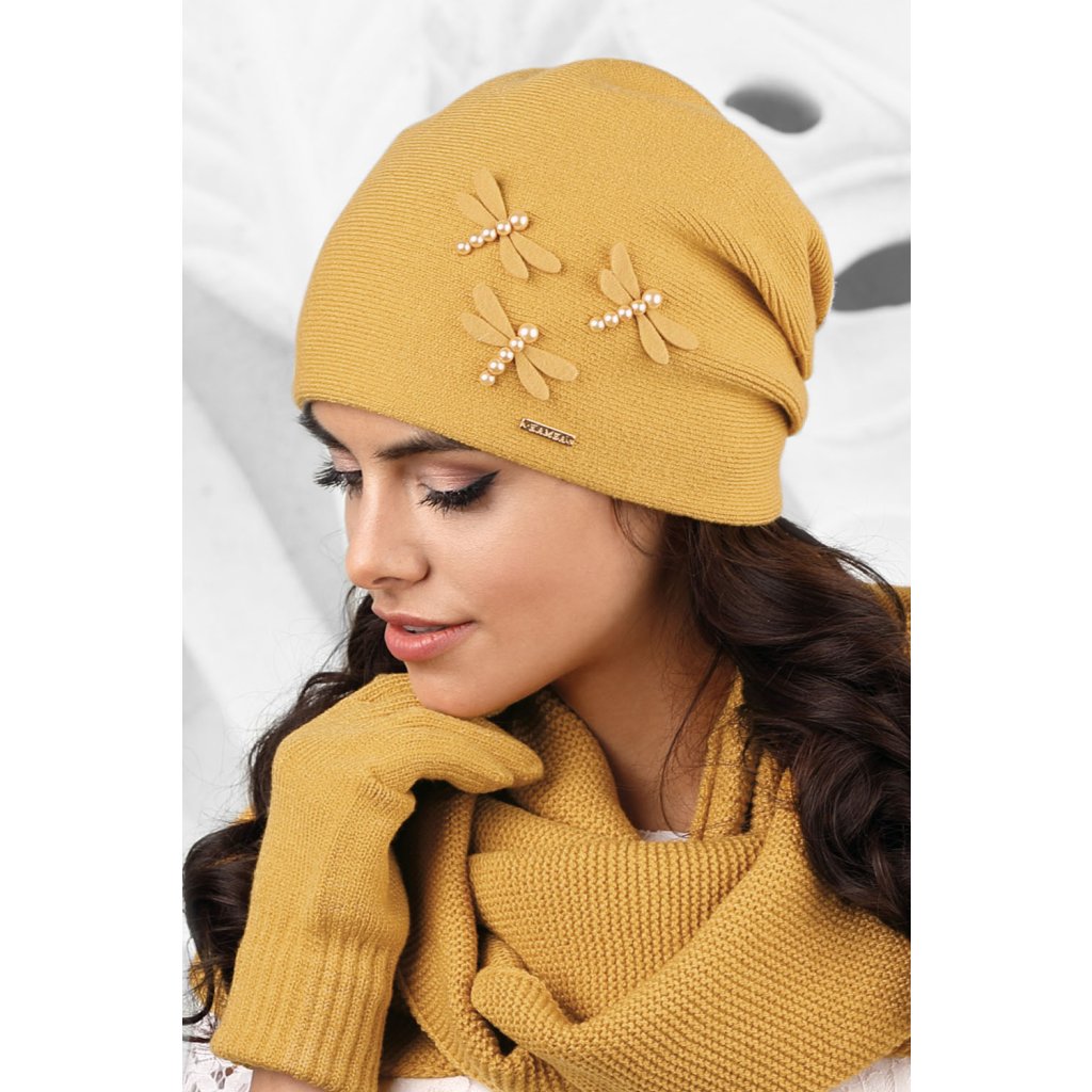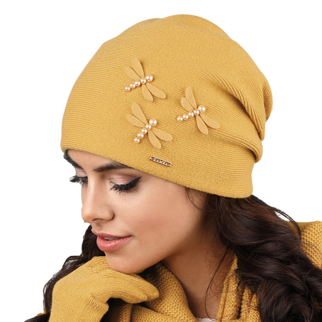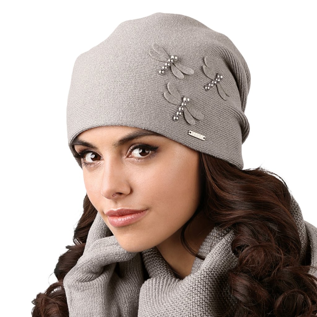 Atraktívny a slušný v každej situácii. Originálna čiapka s dokonalým strihom, ktorý sa prispôsobí každej hlave. Tenká priadza je kombináciou vlny a viskózy. Na boku vystupujú vážky doplnené korálkami. Zadná strana je tvorená klinmi pre lepšie prispôsobenie. Ideálny jesenný kúsok. 40% akryl, 25% viskóza, 20% vlna, 15% elastanDodatočné parametre