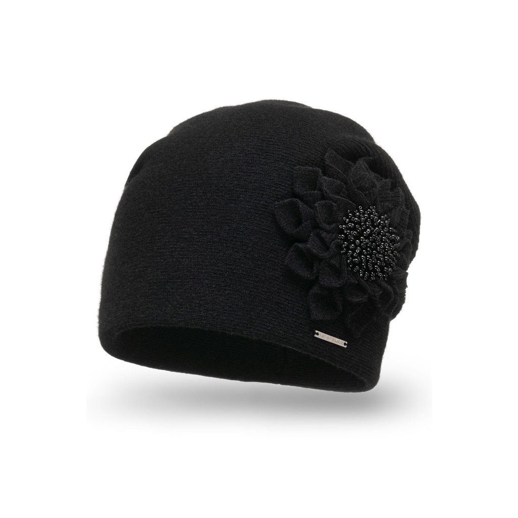 Módna dámska čiapka- predná strana zdobená kvetinovou aplikáciou