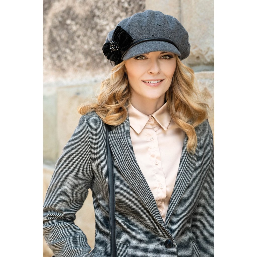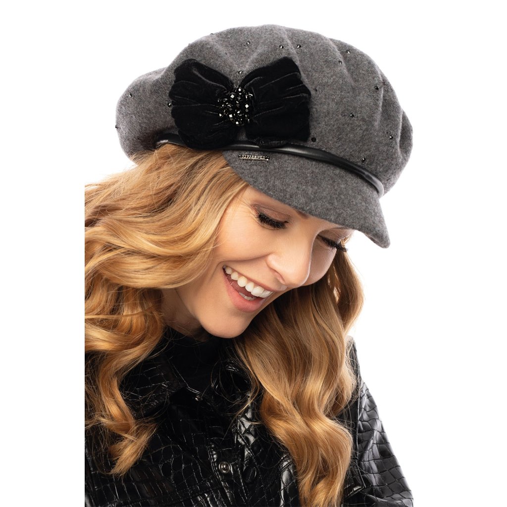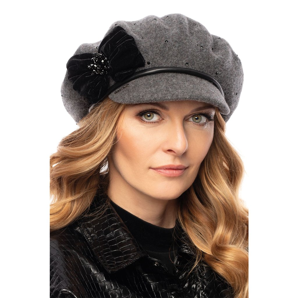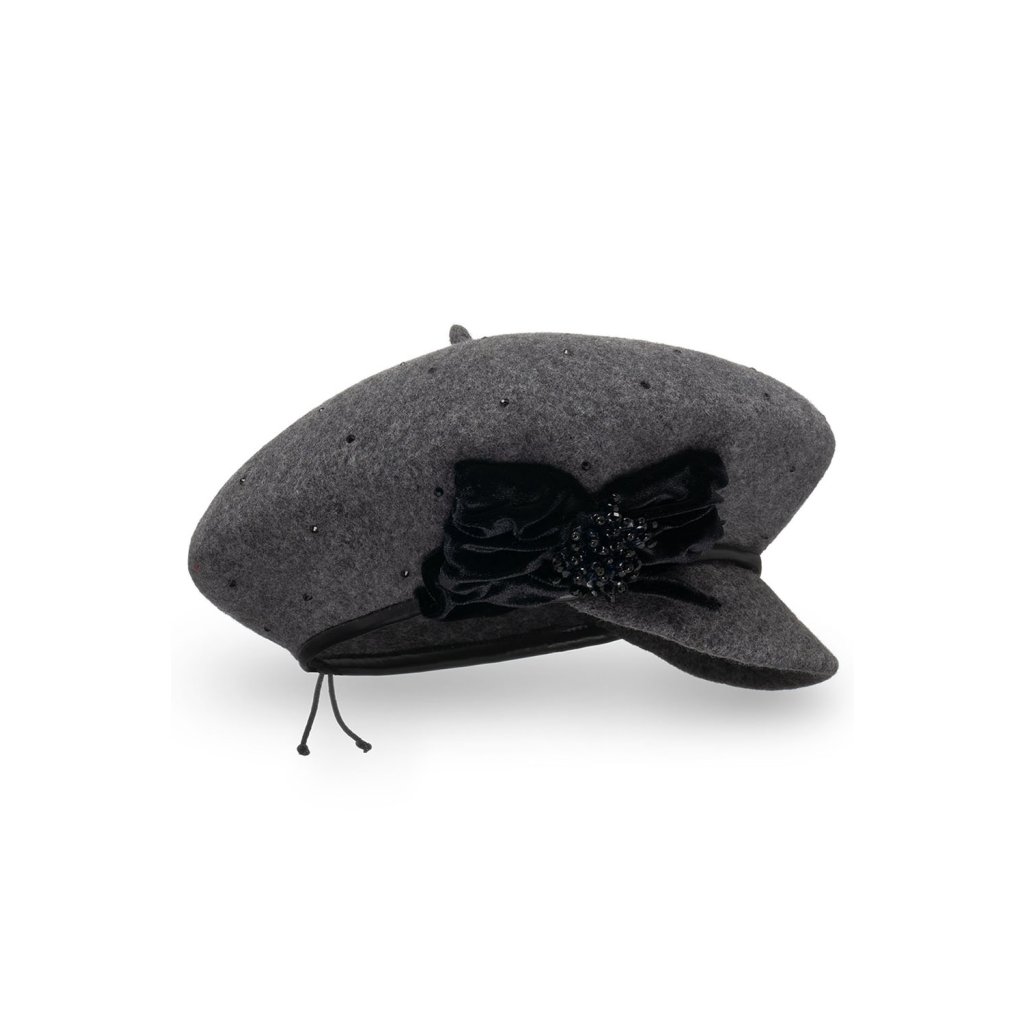 Ručne vyrobená elegantná dámska čiapka s plochou hlavou.Je vyrobená z vysoko kvalitnej novej vlny Woolmark®. Priadza je certifikovaná podľa normy Oeko-Tex. Čiapka je zdobená zamatovou mašľou s korálkami. Vrchná časť je pokrytá čiernymi kamienkami. Nastaviteľný obvod, skryté šnúrky na leme. Výhodou plochej čiapky je ručne vyšívané zdobenie, vďaka ktorému je každý kus jedinečný.