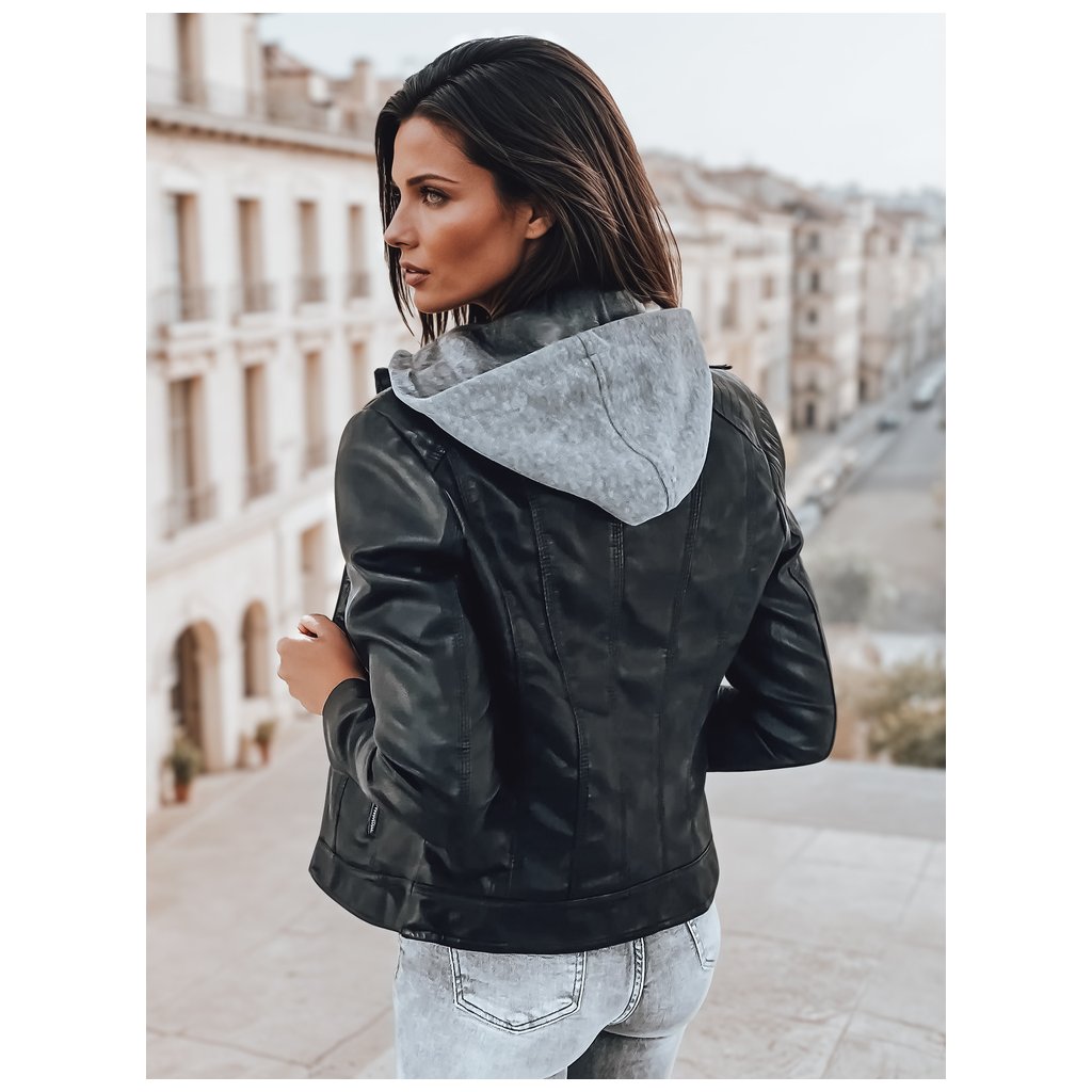 - Dámska koženková bunda so stojačikovým golierom a kapucňou