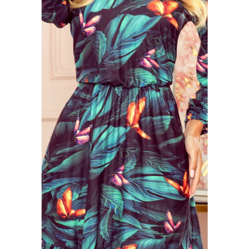 Cora - šaty s výstrihom a volánikom - vzor so zelenými listami a motýľmi. Poľský výrobok. Vyrobené z príjemného na dotyk pružného materiálu. Značka Numoco.