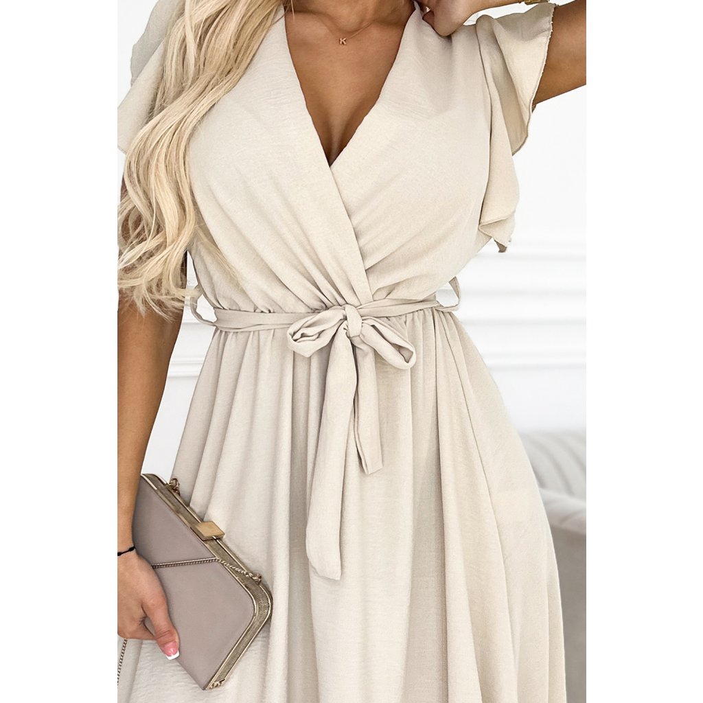 CORNELIA - šaty s listovým výstrihom, volány a zaväzovaním v páse. Farba béžová. Značka Numoco. Európska produkcia.