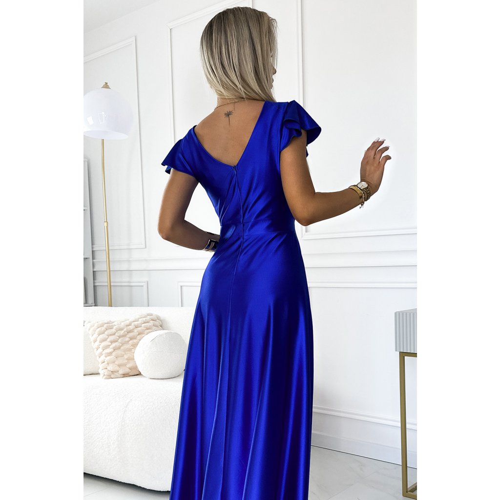 CRYSTAL - dlhé saténové maxi šaty s listovým výstrihom a rozparkom na nohavici. Modrá farba. Šaty krásne odhaľujú dekolt a vyzerajú skvele pri tanci. Zapínanie vzadu na krytý zips. Poľský výrobok. Značka numoco.