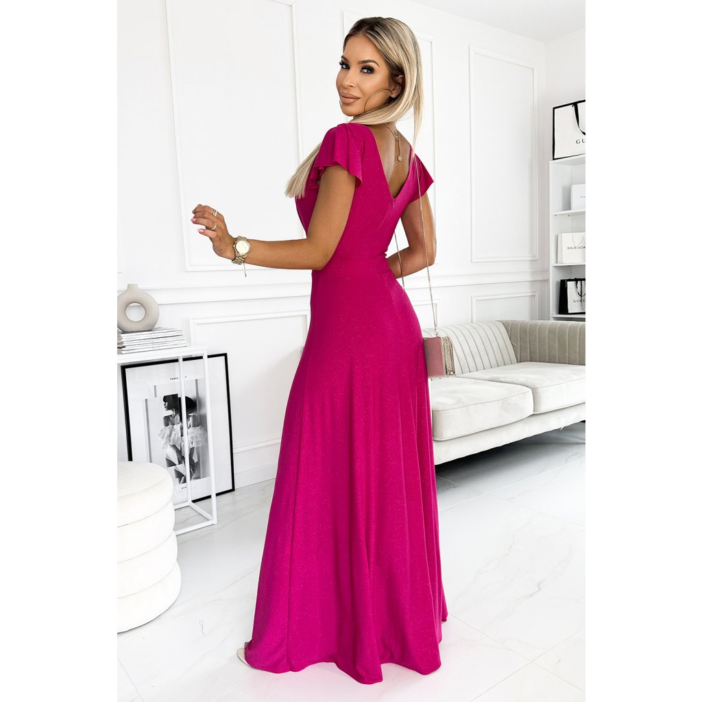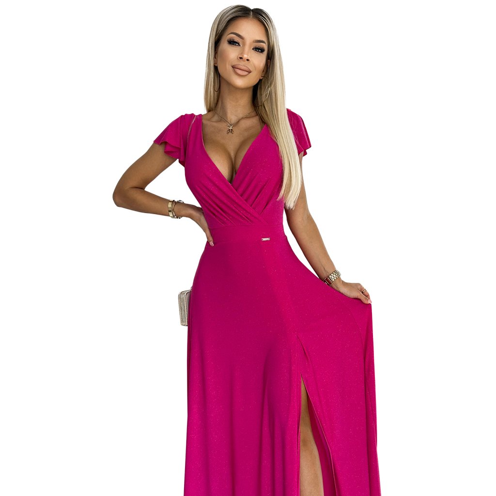 CRYSTAL dlhé lesklé maxi šaty s listovým výstrihom a rozparkom na nohavici. Farba: Fuchsiová s trblietkami. Šaty krásne odhaľujú dekolt a sú skvelé na tanec. Zapínanie späť na zips. Poľský výrobok. Značka Numoco.