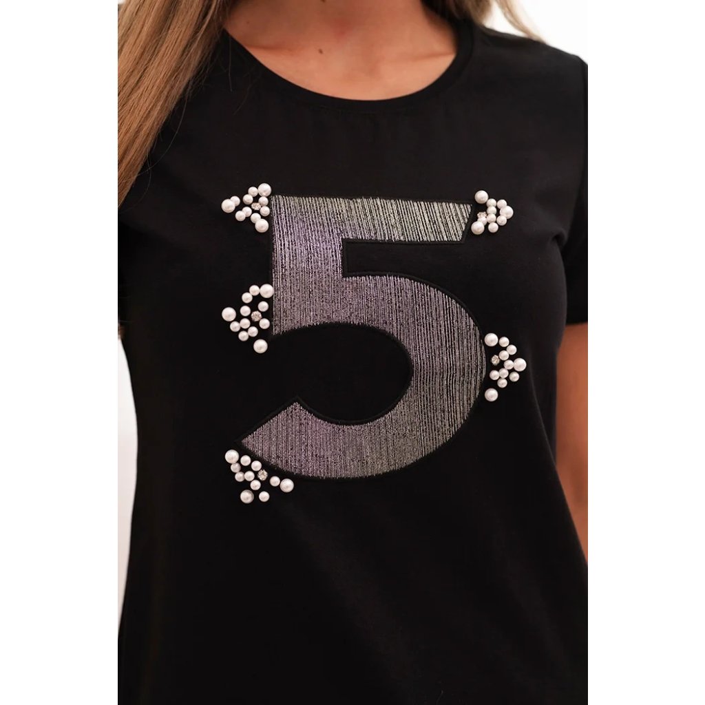 Dámska blúzka s krátkym rukávom a efektnou nášivkou s číslom „5“ ozdobenou perličkami je ideálnou ponukou pre ženy, ktoré majú rady módne a originálne akcenty v každodennom oblečení. Vyrobená z vysoko kvalitnej bavlny s prídavkom elastanu, zaisťuje pohodlie a správne prispôsobenie postave.