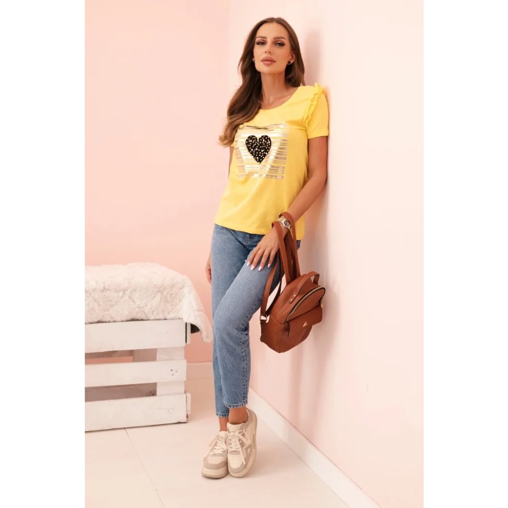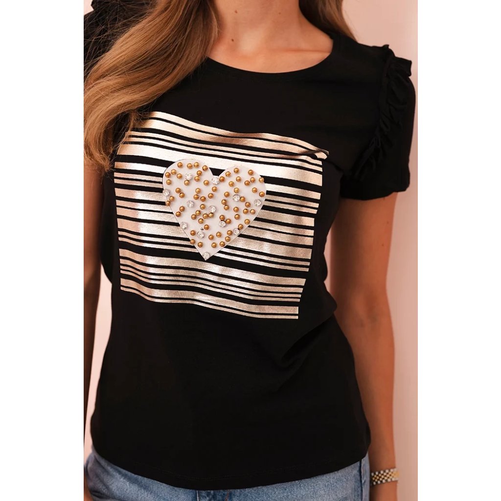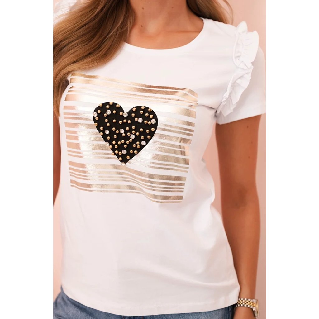 Stavte na jemné kúzlo a ženský detail! Táto dámska blúzka s krátkym rukávom očarí dekoratívnou aplikáciou v tvare srdca z lesklých kamienkov a roztomilými volánikmi na ramenách. To je ideálny návrh pre ženy, ktoré chcú dodať svojmu štýlu ľahkosť a módny akcent.
