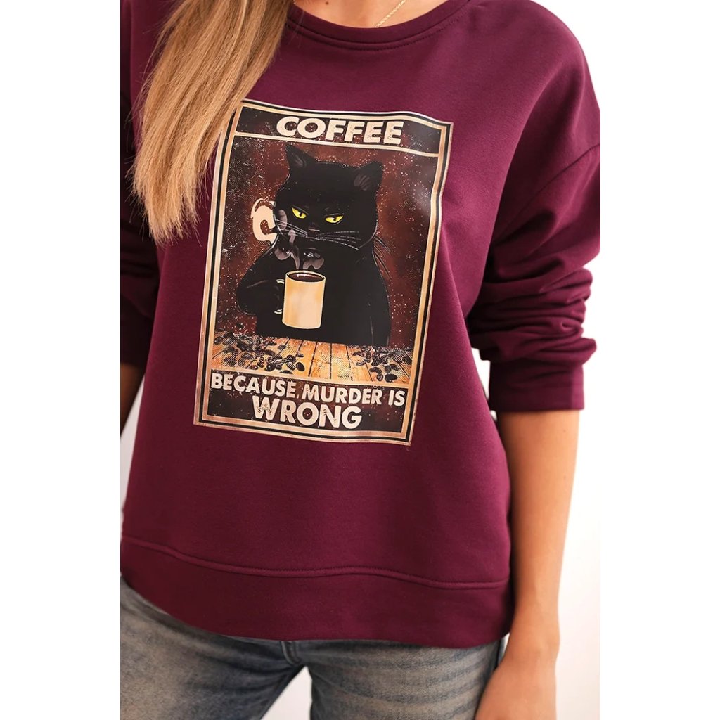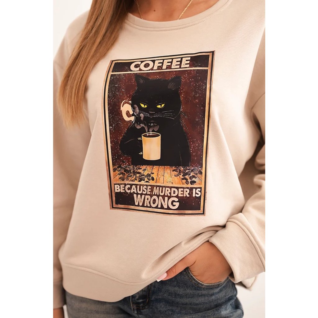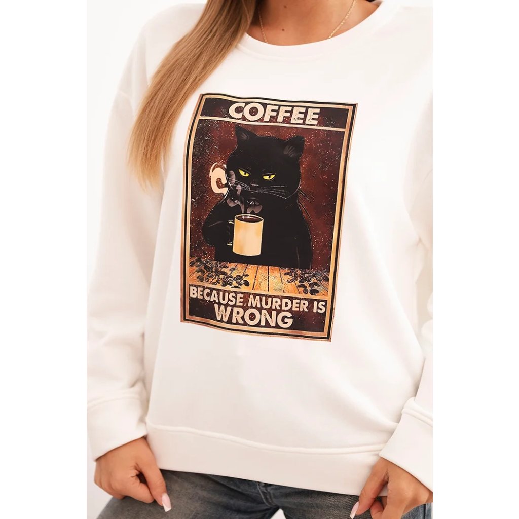 Hľadáte mikinu, ktorá spája pohodlie, zmysel pre humor a módny vzhľad? Táto dámska mikina s potlačou mačky držiacej kávu a nápisom "Because murder is wrong" je ideálnou voľbou pre milovníčky netradičných štylizácií. Voľný strih zaisťuje slobodu pohybu a mäkký materiál garantuje komfort po celý deň. Mikina má klasický, okrúhly výstrih a dlhé rukávy, ktoré dobre sedia.