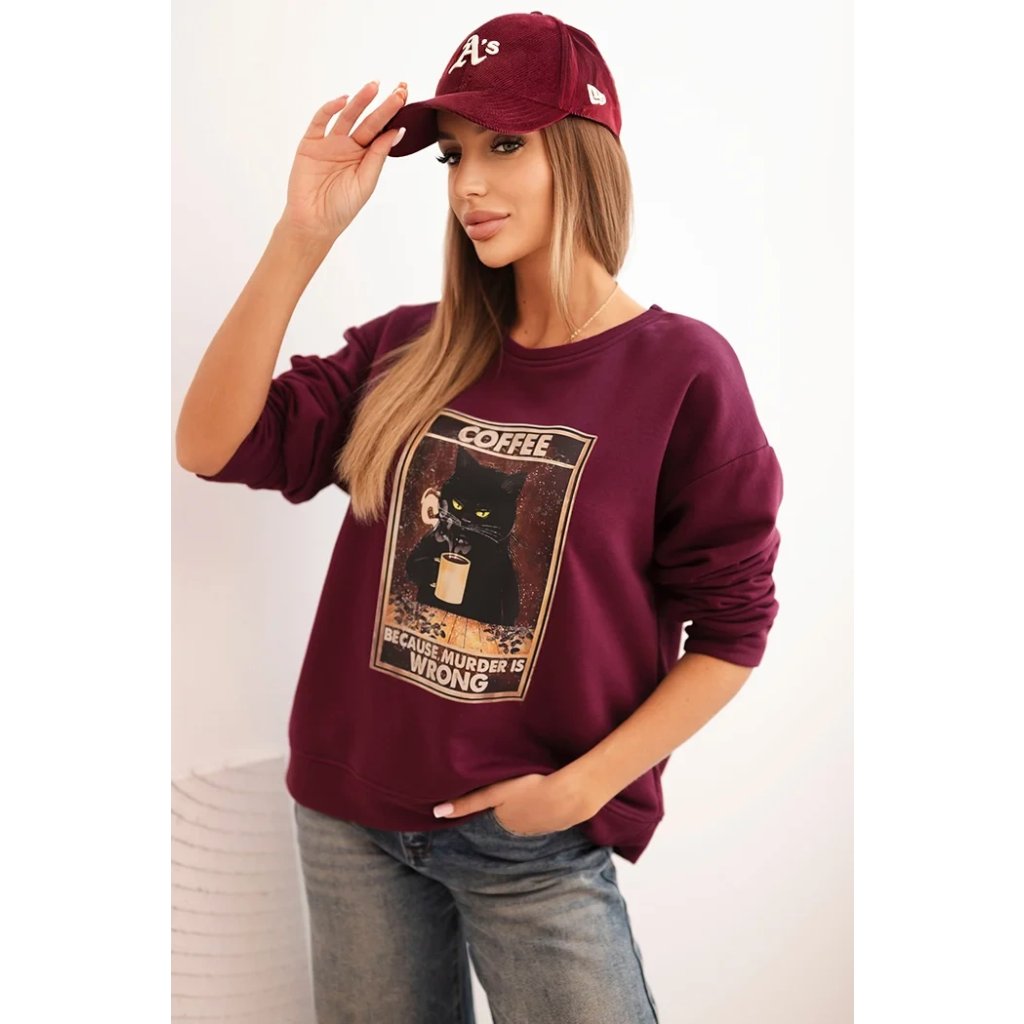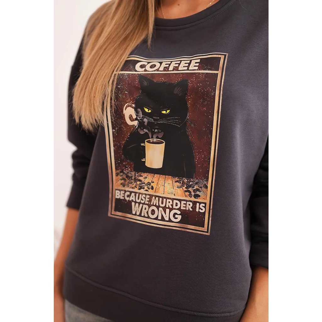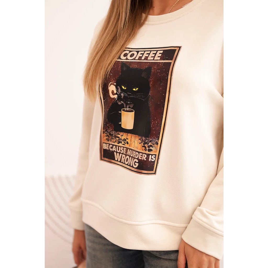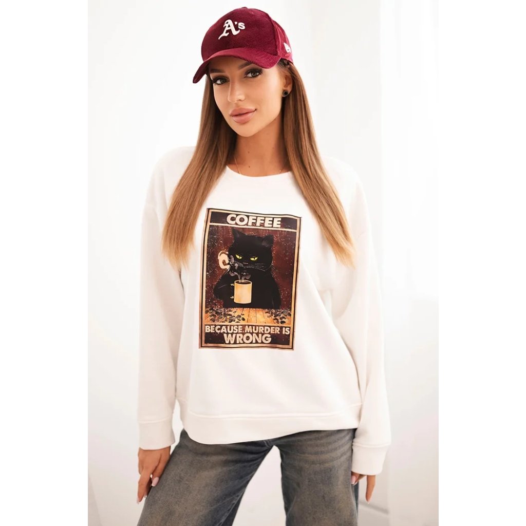 Hľadáte mikinu, ktorá spája pohodlie, zmysel pre humor a módny vzhľad? Táto dámska mikina s potlačou mačky držiacej kávu a nápisom "Because murder is wrong" je ideálnou voľbou pre milovníčky netradičných štylizácií. Voľný strih zaisťuje slobodu pohybu a mäkký materiál garantuje komfort po celý deň. Mikina má klasický, okrúhly výstrih a dlhé rukávy, ktoré dobre sedia.