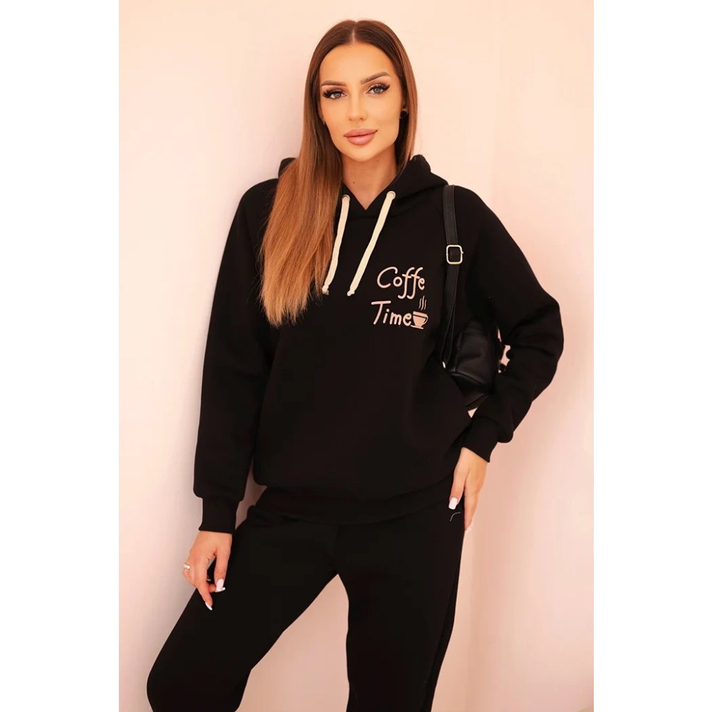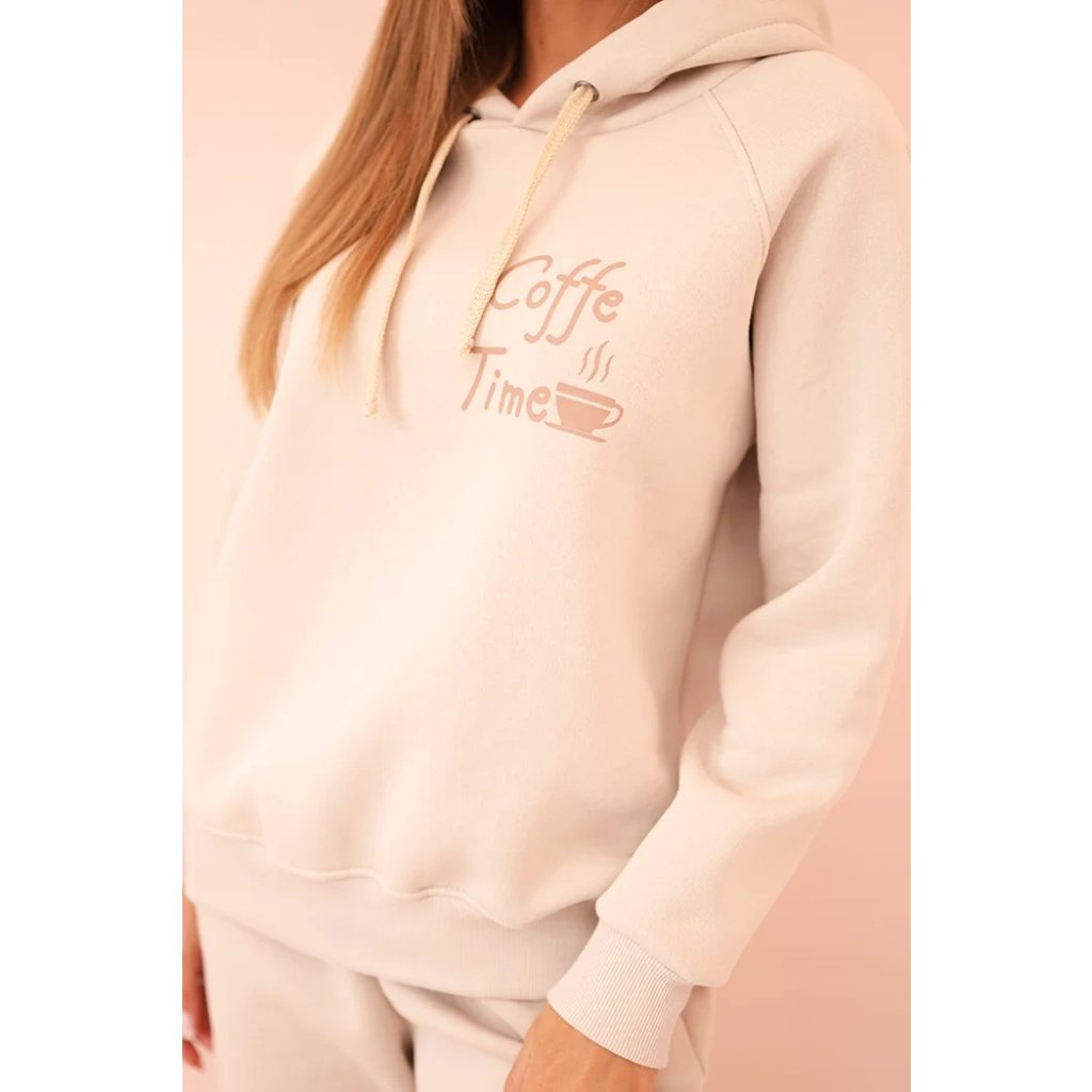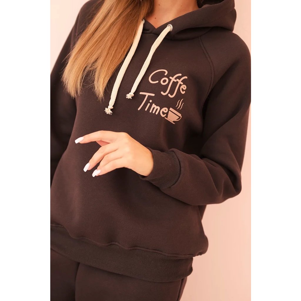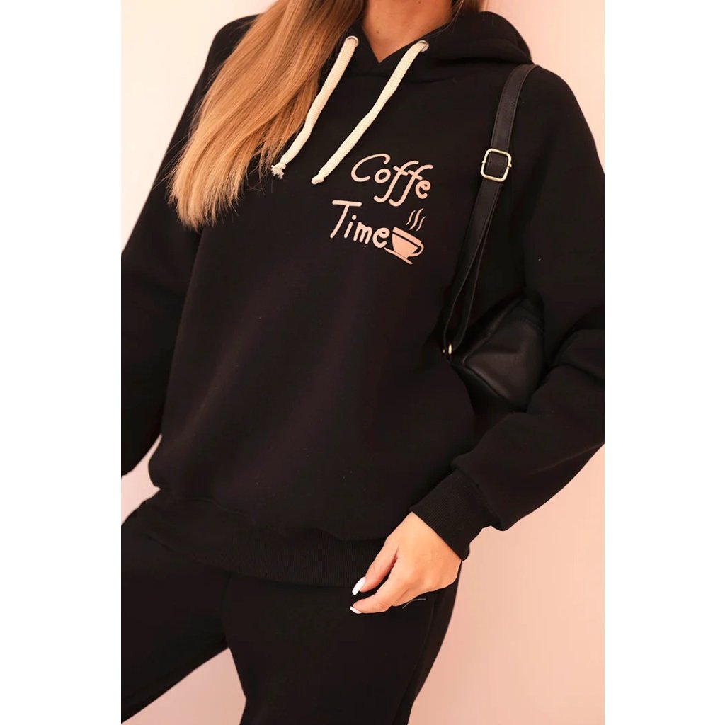 Tento dámsky zateplený dres je ideálnou voľbou na chladnejšie dni. Vyrobený z mäkkého, príjemného materiálu, zaisťuje maximálny komfort nosenia ako doma, tak na prechádzke alebo pri každodenných aktivitách. Mikina s kapucňou a potlačou „Coffe Time“ dodáva celku uvoľnený, pohodový charakter, zatiaľ čo nohavice s elastickým pásom skvele padnú na postavu.