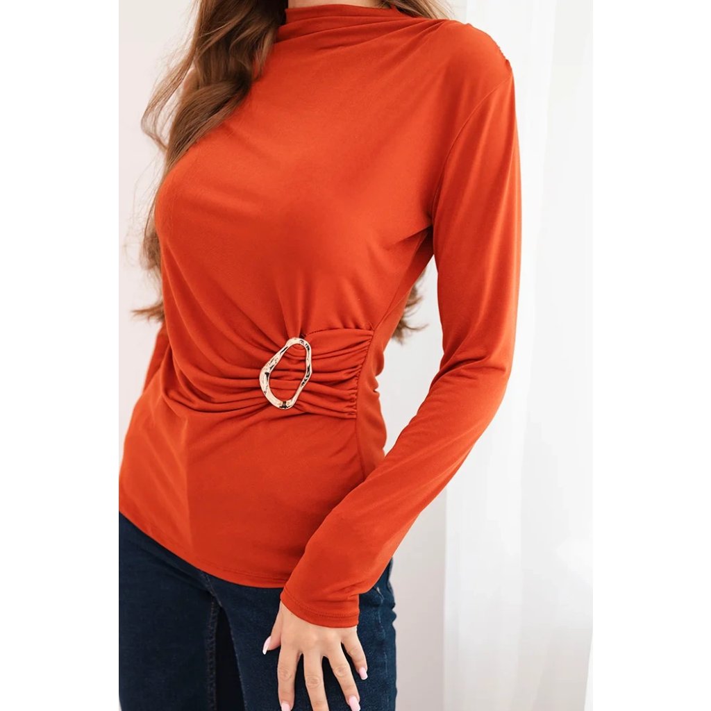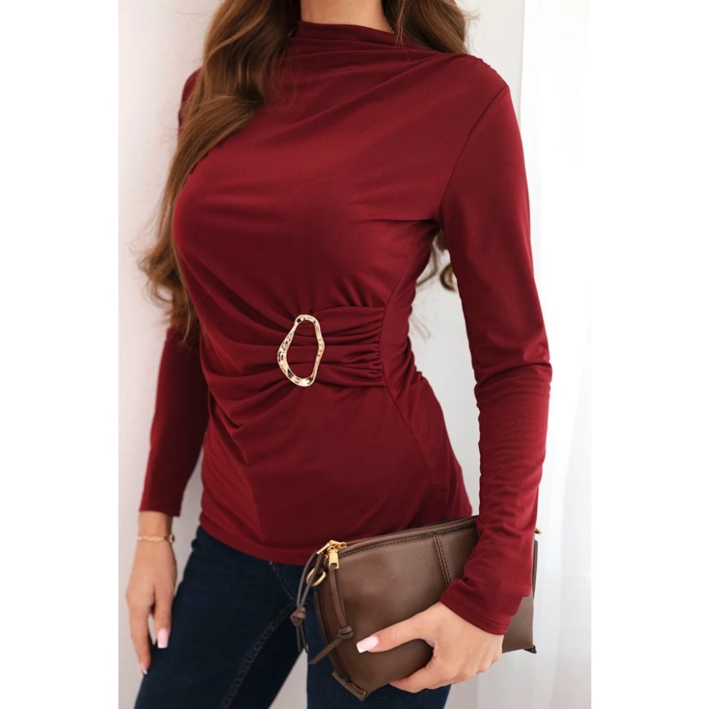 Elegantná dámska blúzka s prídavkom viskózy je vynikajúcou voľbou pre ženy, ktoré ocenia pohodlie a štýlové detaily. Model má jemné nariasenie po boku, zvýraznené efektnou zlatou sponou, čo krásne modeluje pás a dodáva postave ženský tvar. Dlhý rukáv a vyšší výstrih zaisťujú, že blúzka vyzerá veľmi elegantne.