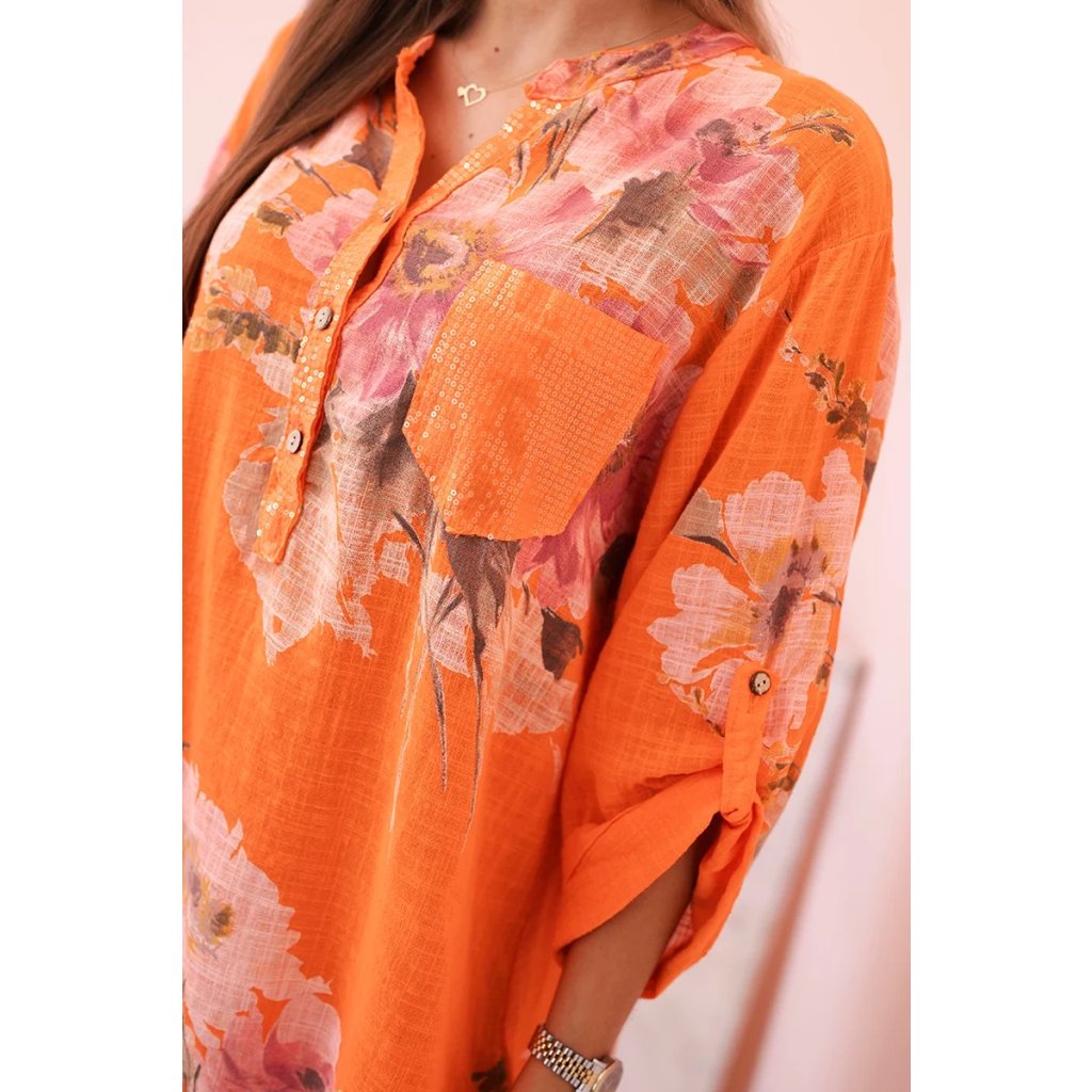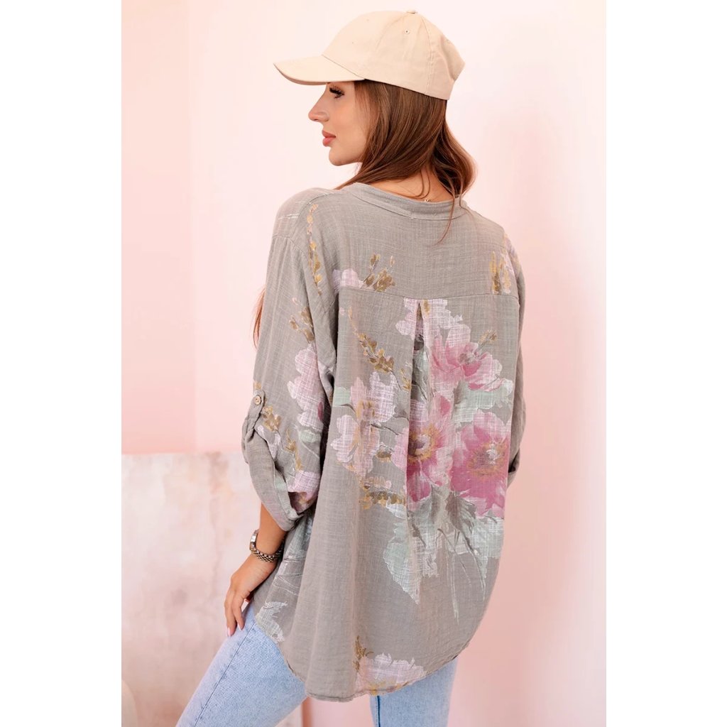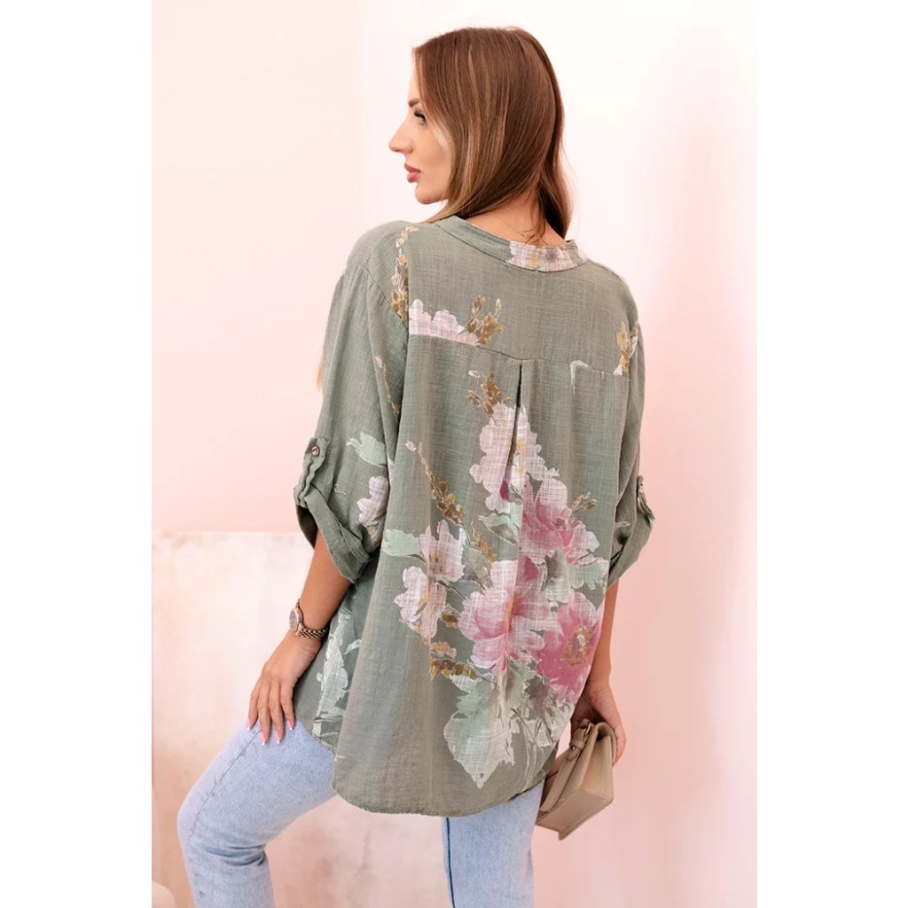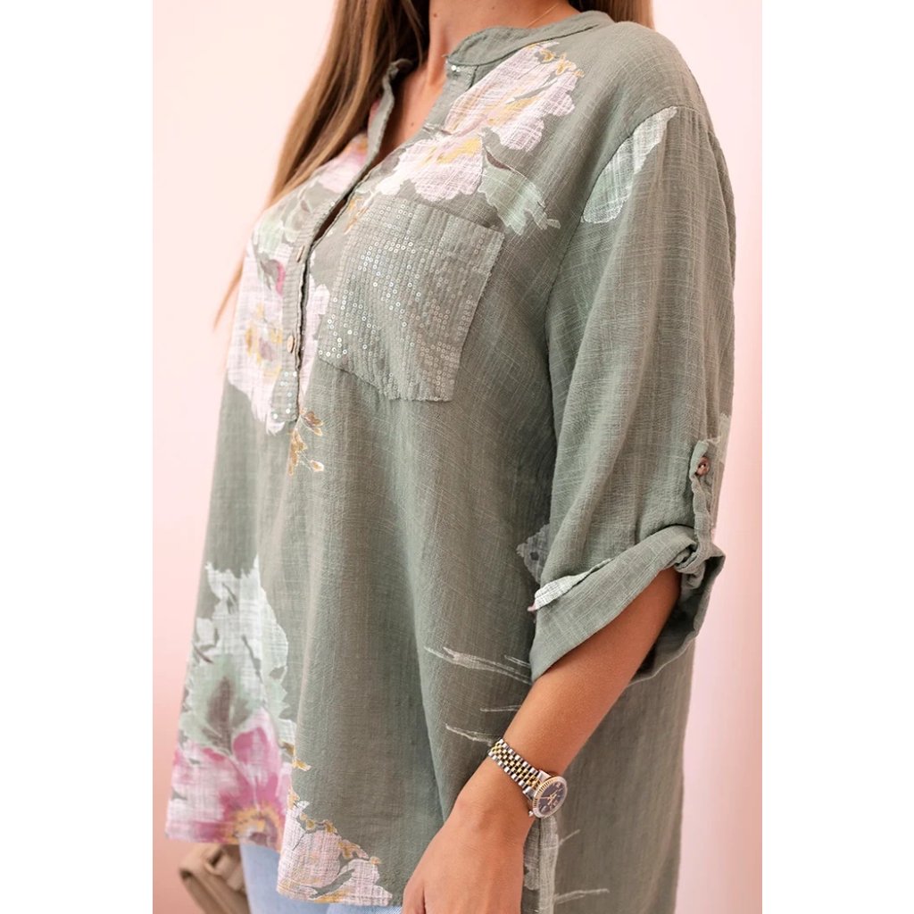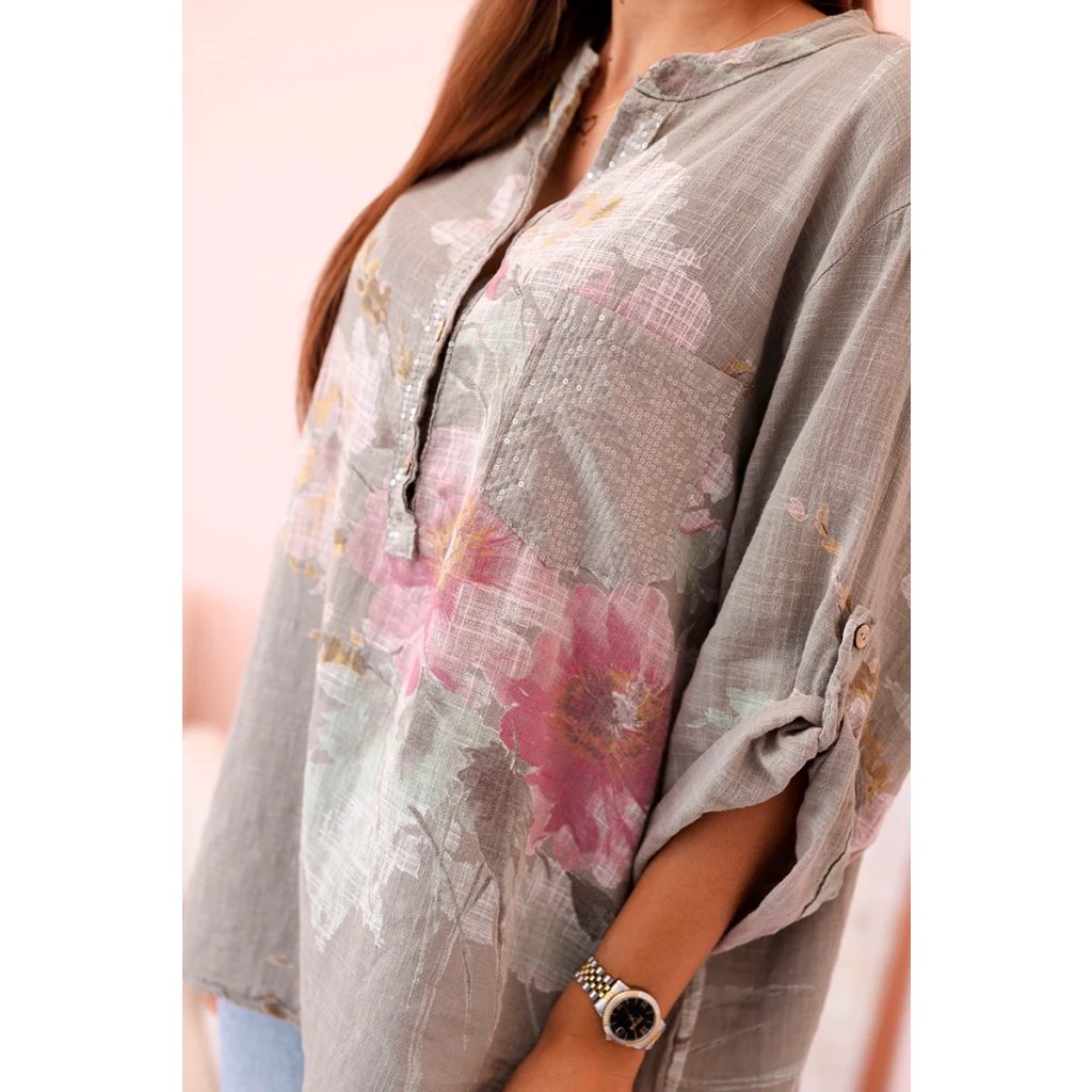 Ľahká dámska blúzka vyrobená zo 100 % prírodnej bavlny, ktorá zaručuje výnimočné pohodlie a priedušnosť aj počas teplých dní. Model zdobí veľký kvetinový vzor a jemný lesk malých flitrov na vreckách. Výstrih do V s čiastočným zapínaním na gombíky zdôrazňuje ženský štýl, zatiaľ čo zaoblený chrbát a vyhrnuté rukávy dodávajú ležérny nádych. Skvelý tip na džínsy, plátenné nohavice alebo ľahkú sukňu.