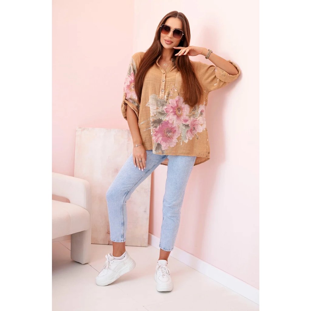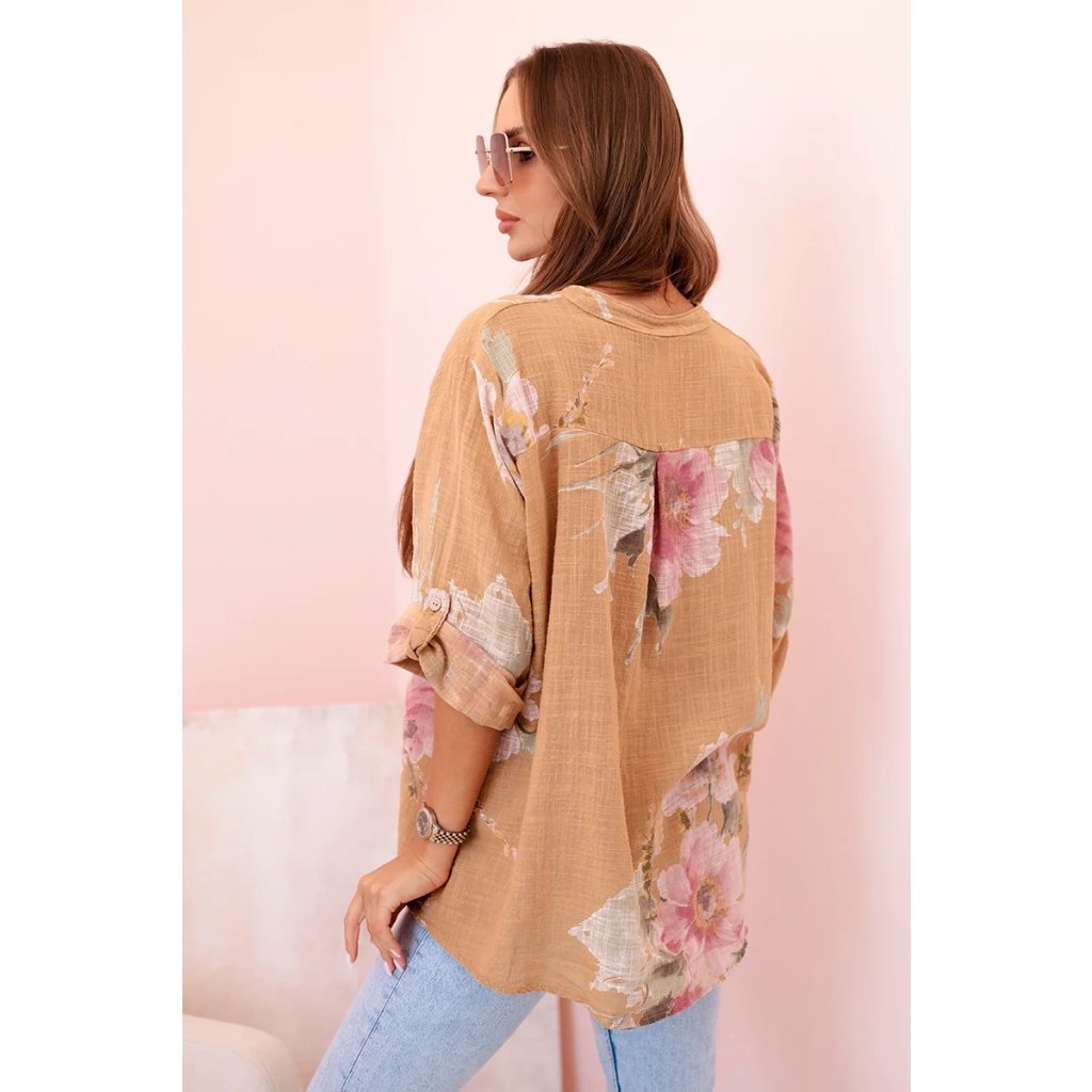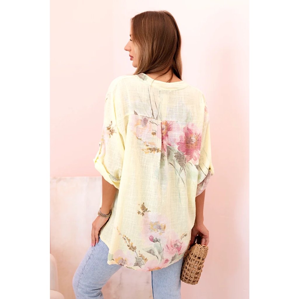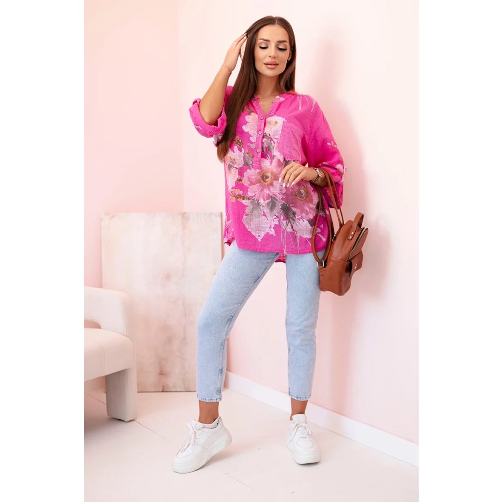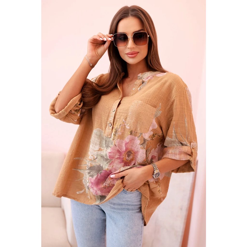 Ľahká dámska blúzka vyrobená zo 100 % prírodnej bavlny, ktorá zaručuje výnimočné pohodlie a priedušnosť aj počas teplých dní. Model zdobí veľký kvetinový vzor a jemný lesk malých flitrov na vreckách. Výstrih do V s čiastočným zapínaním na gombíky zdôrazňuje ženský štýl, zatiaľ čo zaoblený chrbát a vyhrnuté rukávy dodávajú ležérny nádych. Skvelý tip na džínsy, plátenné nohavice alebo ľahkú sukňu.