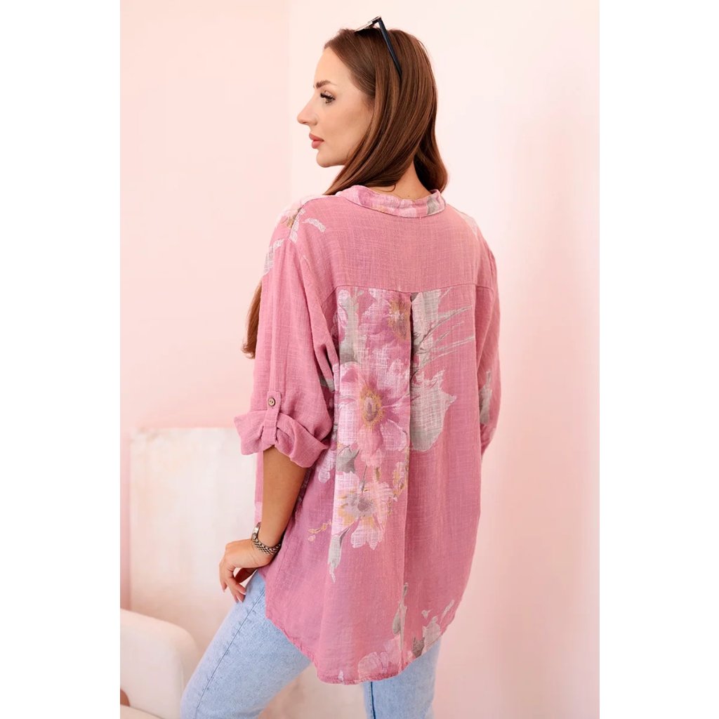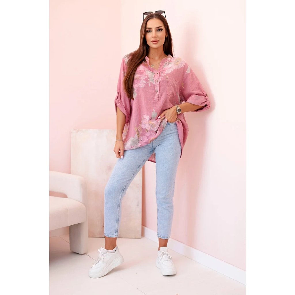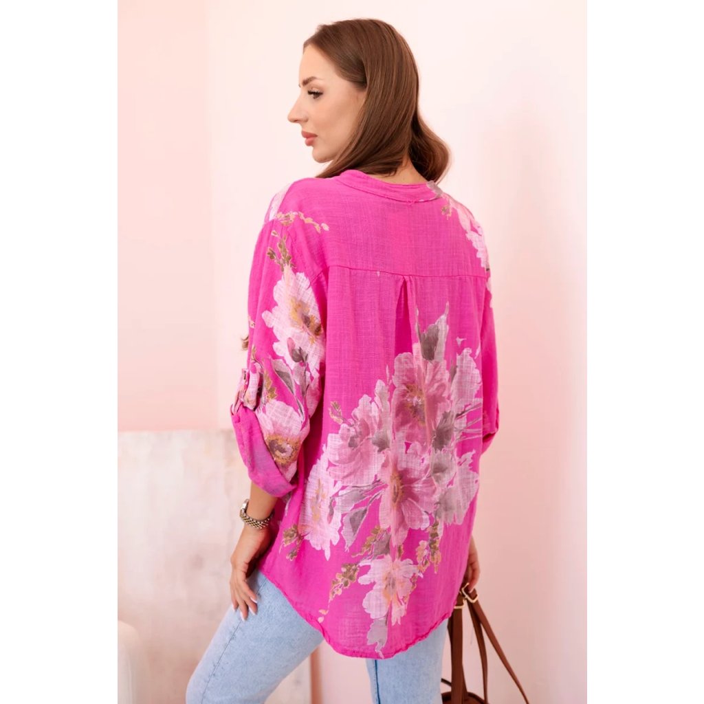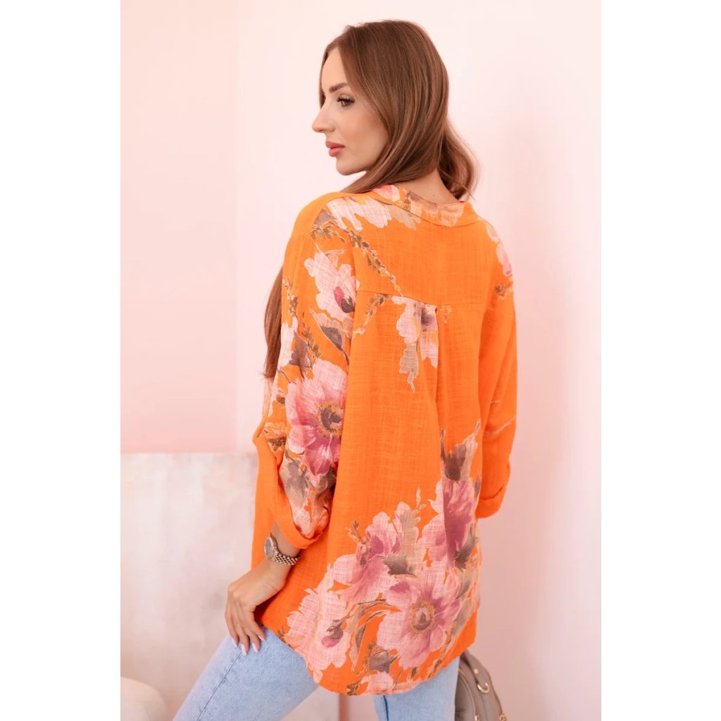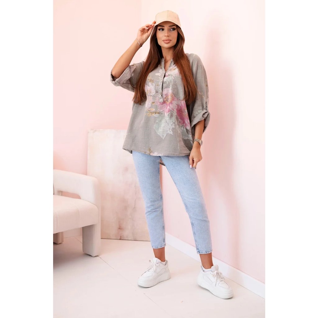 Ľahká dámska blúzka vyrobená zo 100 % prírodnej bavlny, ktorá zaručuje výnimočné pohodlie a priedušnosť aj počas teplých dní. Model zdobí veľký kvetinový vzor a jemný lesk malých flitrov na vreckách. Výstrih do V s čiastočným zapínaním na gombíky zdôrazňuje ženský štýl, zatiaľ čo zaoblený chrbát a vyhrnuté rukávy dodávajú ležérny nádych. Skvelý tip na džínsy, plátenné nohavice alebo ľahkú sukňu.