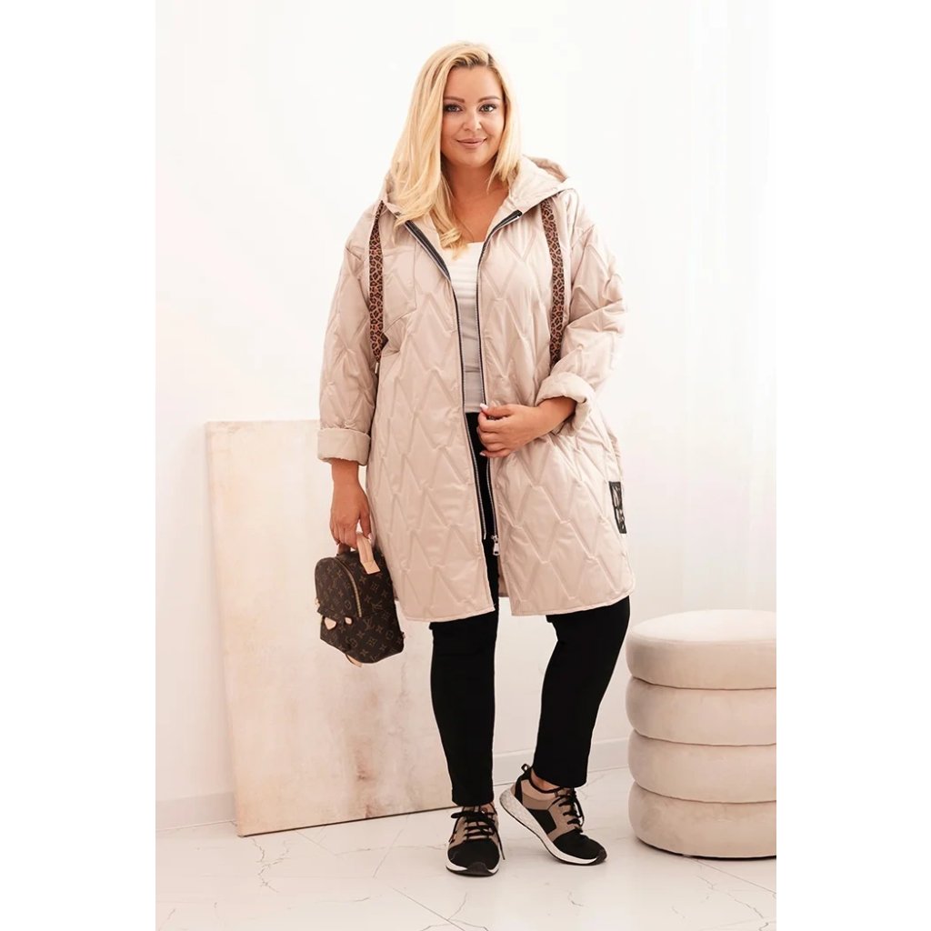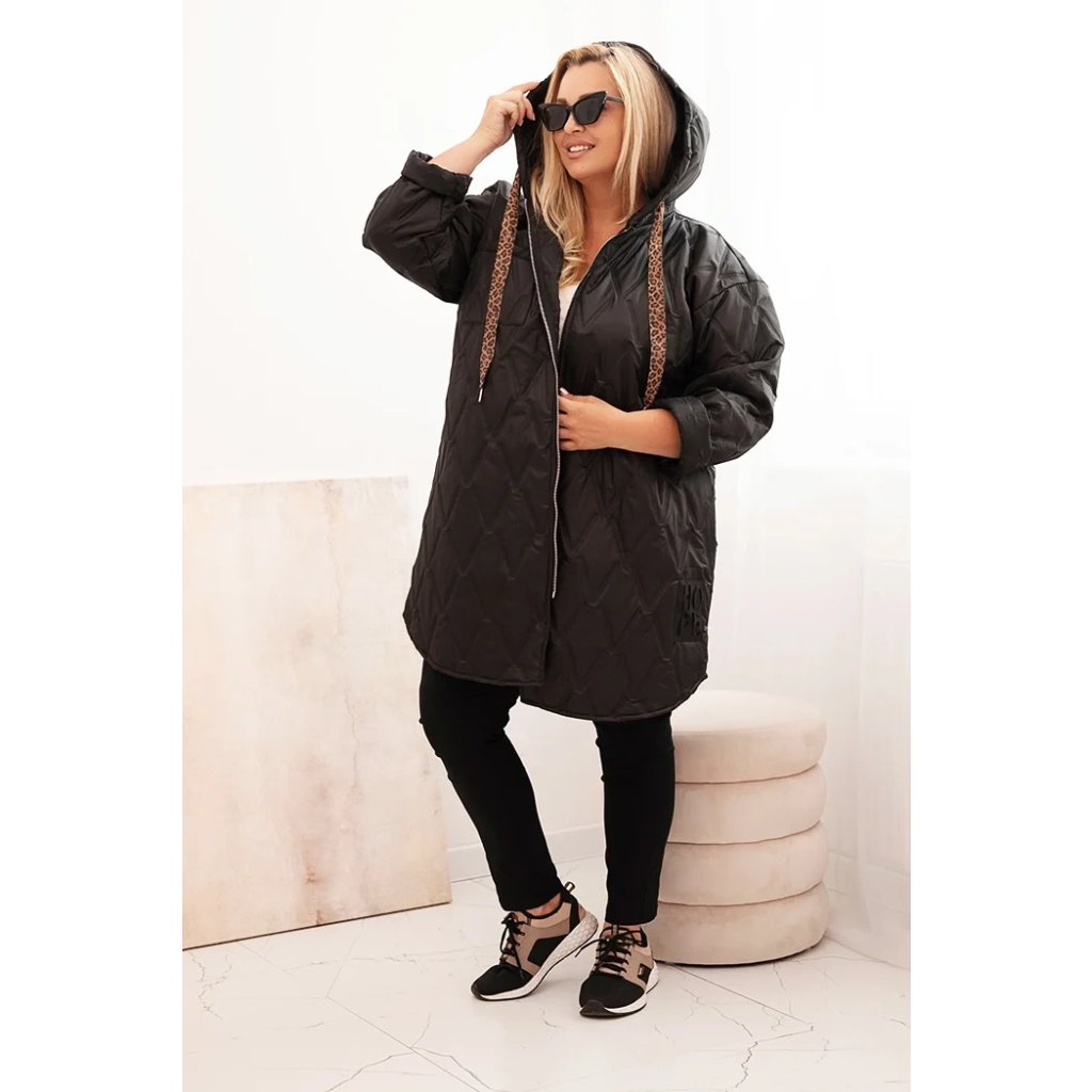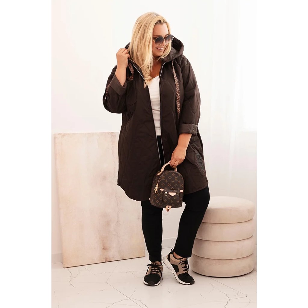Štýlová dámska prešívaná bunda vo veľkosti plus size je vynikajúcou voľbou pre ženy nosiace väčšie veľkosti – od XL do 4XL. Jej voľný, oversized strih zaisťuje maximálny komfort nosenia a skvele sa prispôsobuje postave, neobmedzuje pohyb. Model sa vyznačuje geometrickým prešívaním, ktoré opticky zoštíhľuje siluetu, a módnou kapucňou so sťahovacou šnúrkou v leopardom vzore. Zips a praktické vrecko na prsiach podčiarkujú moderný a funkčný charakter bundy.